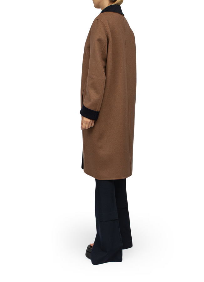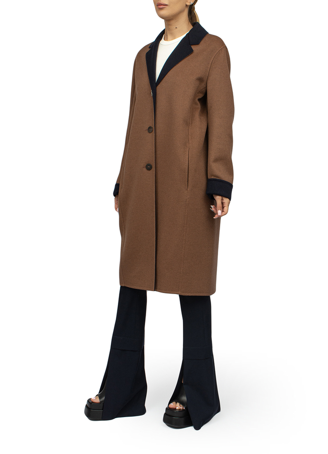 - Two-tone wool and cashmere blend Anagram coat. Notched lapels, button fastening, long sleeves, two side slit pockets, straight hem, mid length.