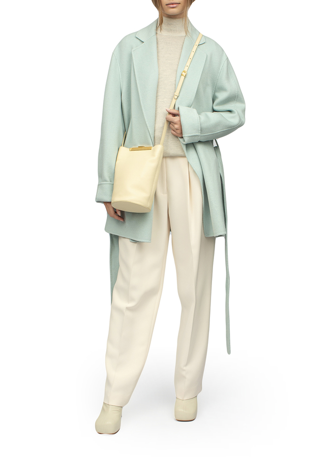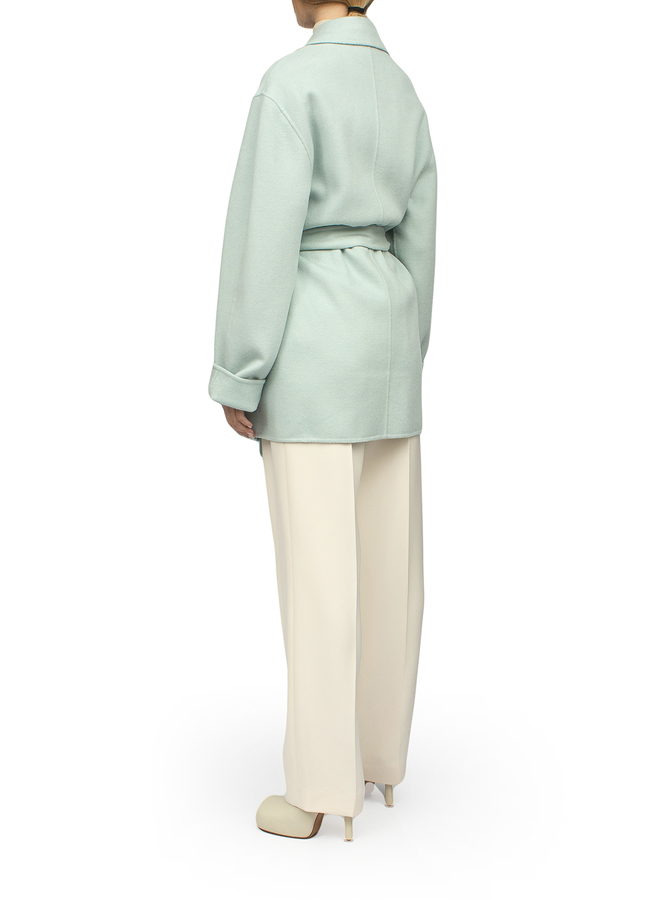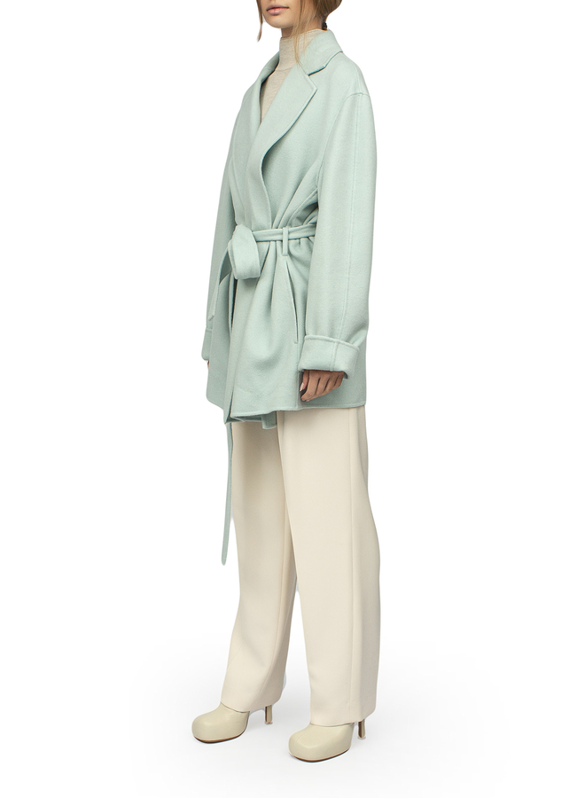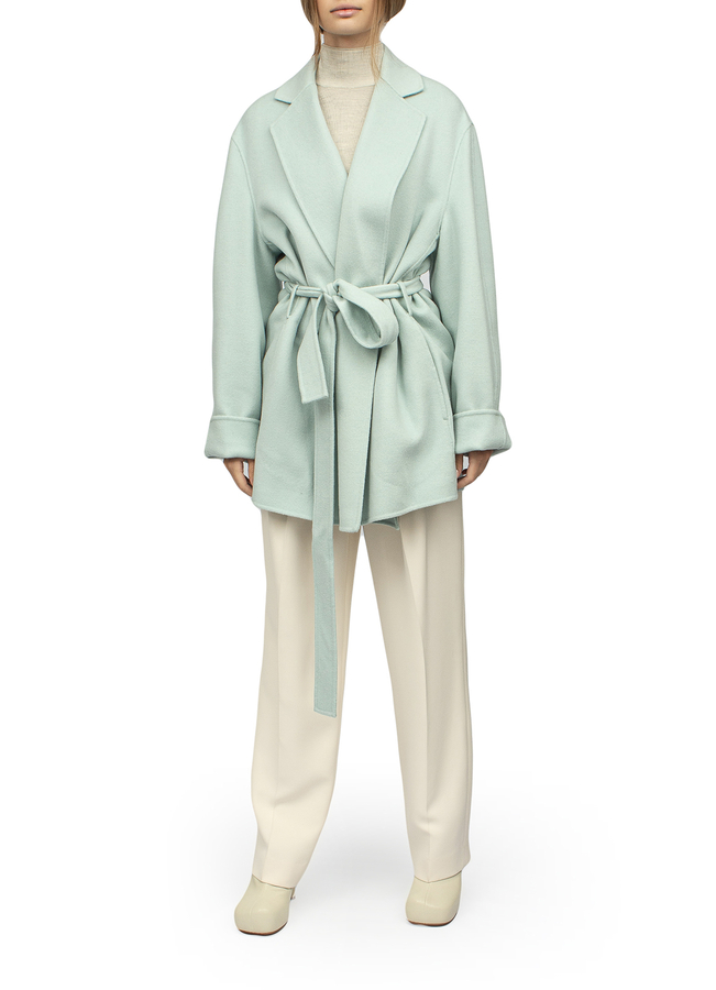 - The coat is short with an adjustable belt and long sleeves. Two side slit pockets, straight hem, shaped collar. Without clasp.