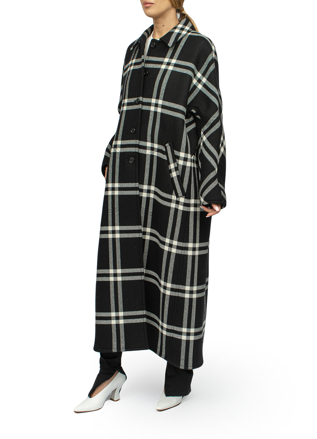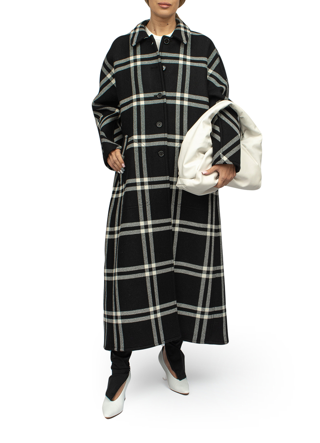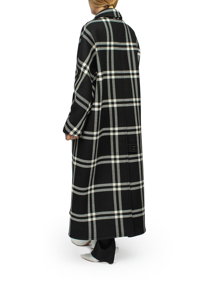 - Single-breasted long coat in a large black and white check. Classic collar, button fastening, long sleeves, two slit pockets on the sides. With a deep cut at the back, relaxed fit, A-line silhouette.