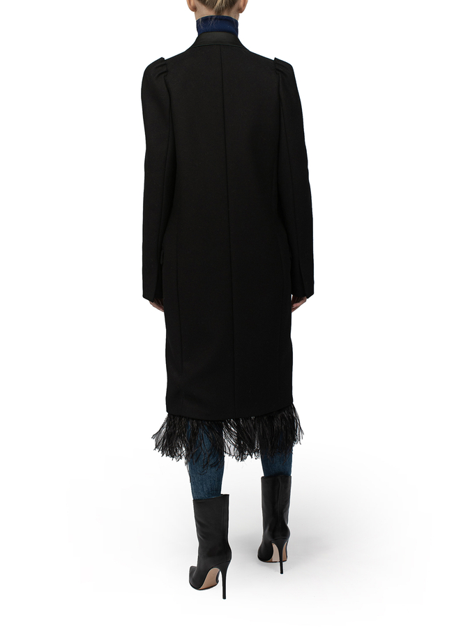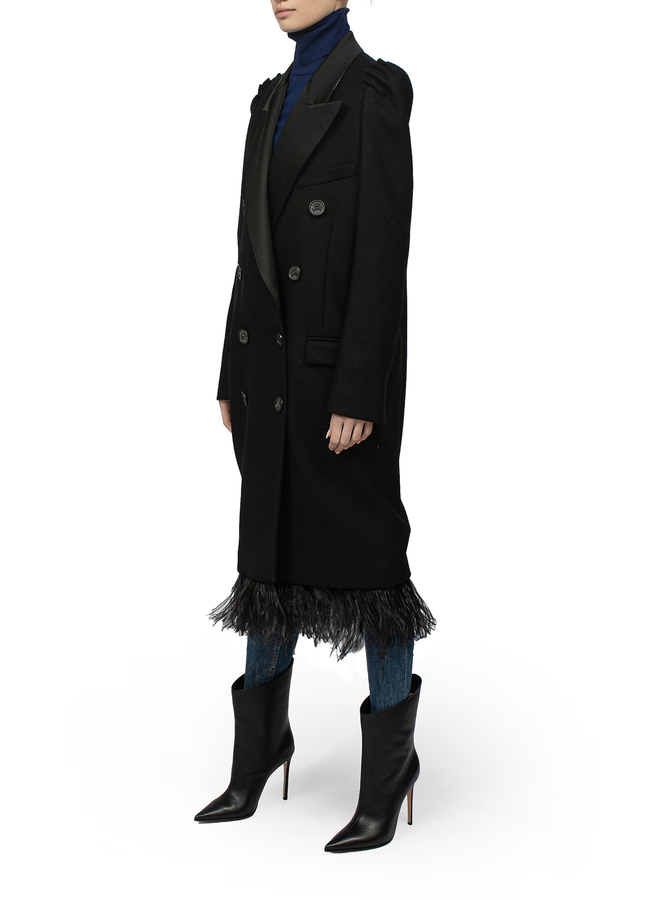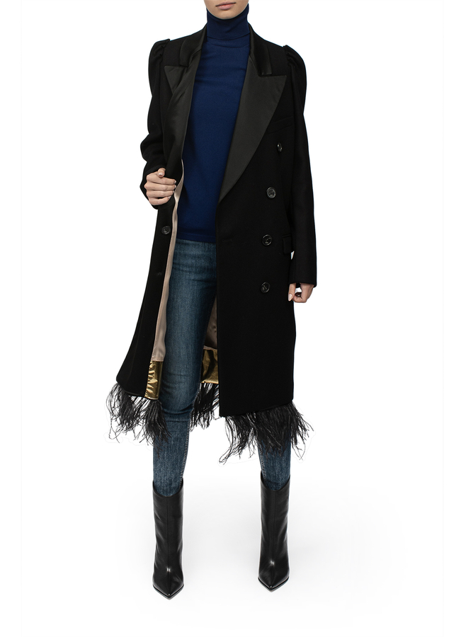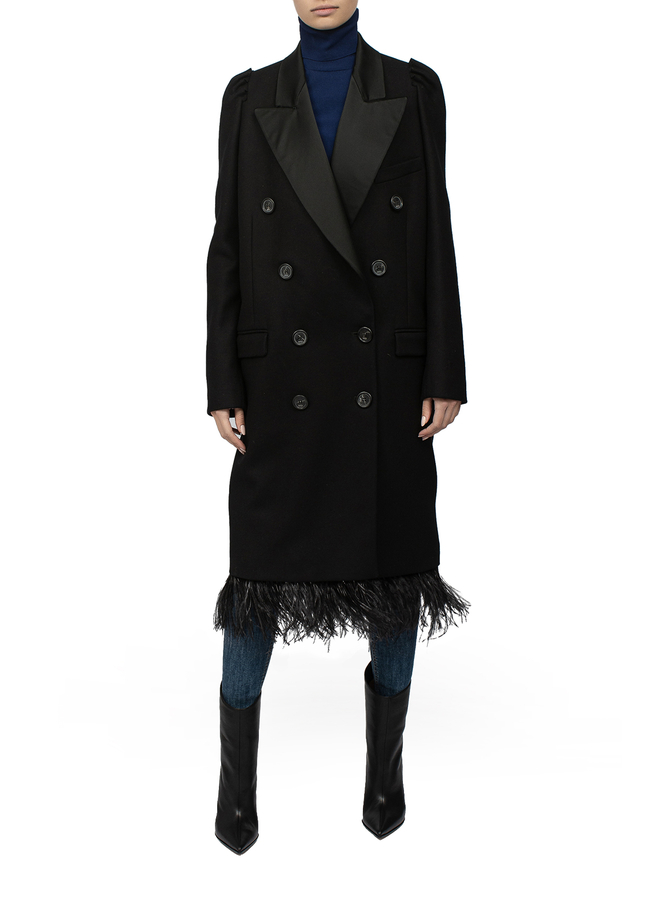 - Double-breasted coat, medium length with 8 buttons, tuxedo collar and lapels, side flap pockets, hem decorated with natural ostrich feathers.