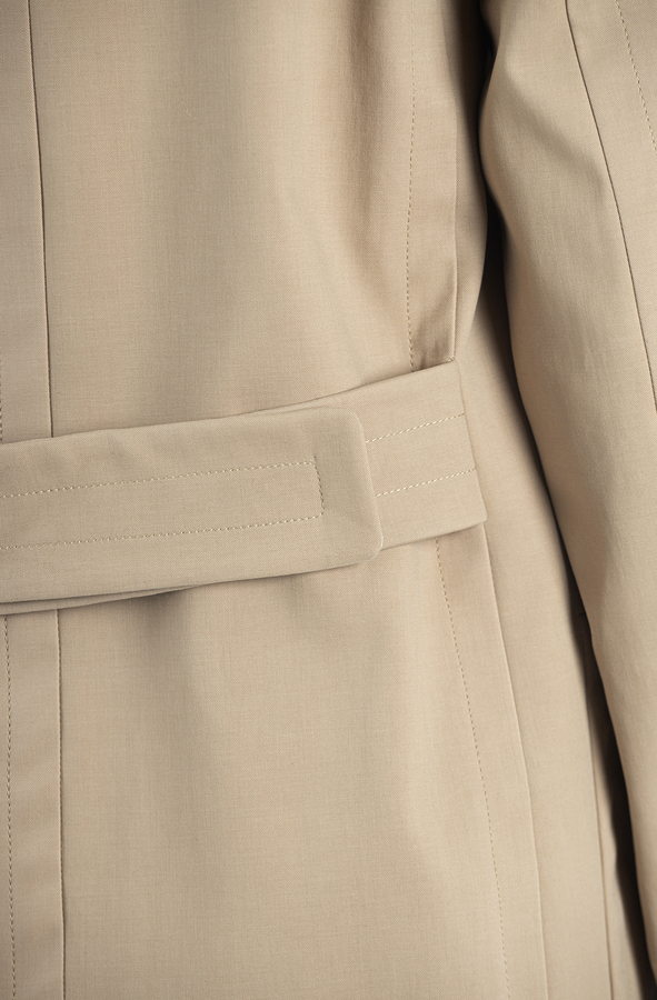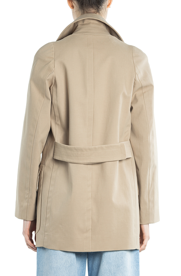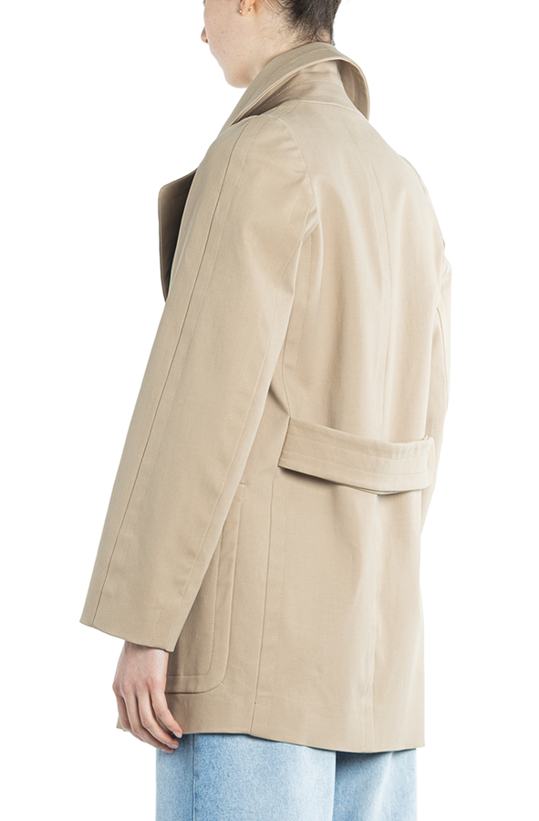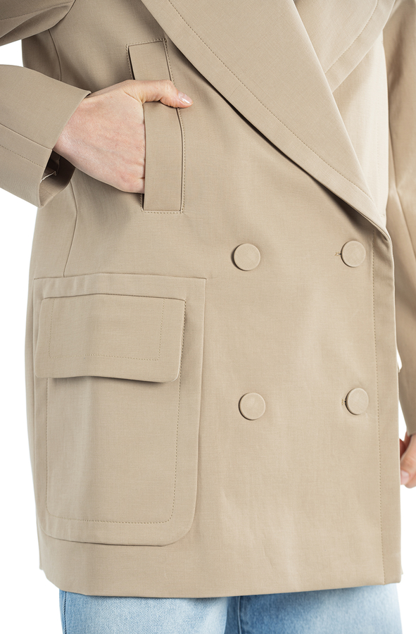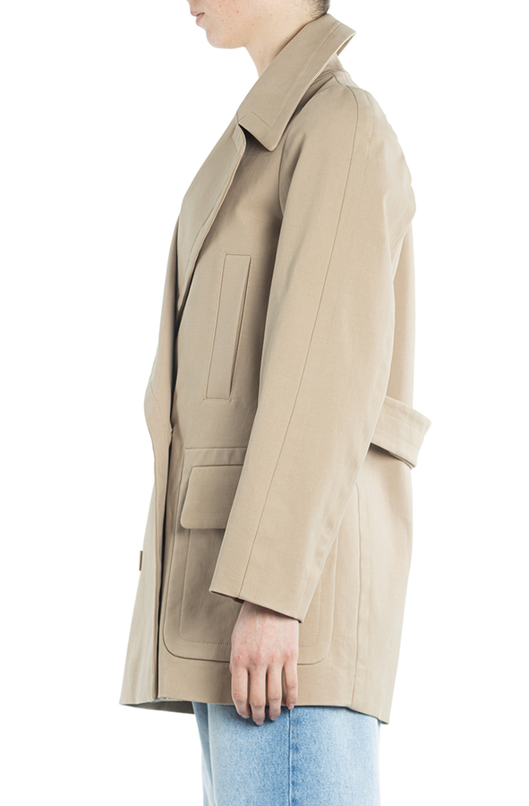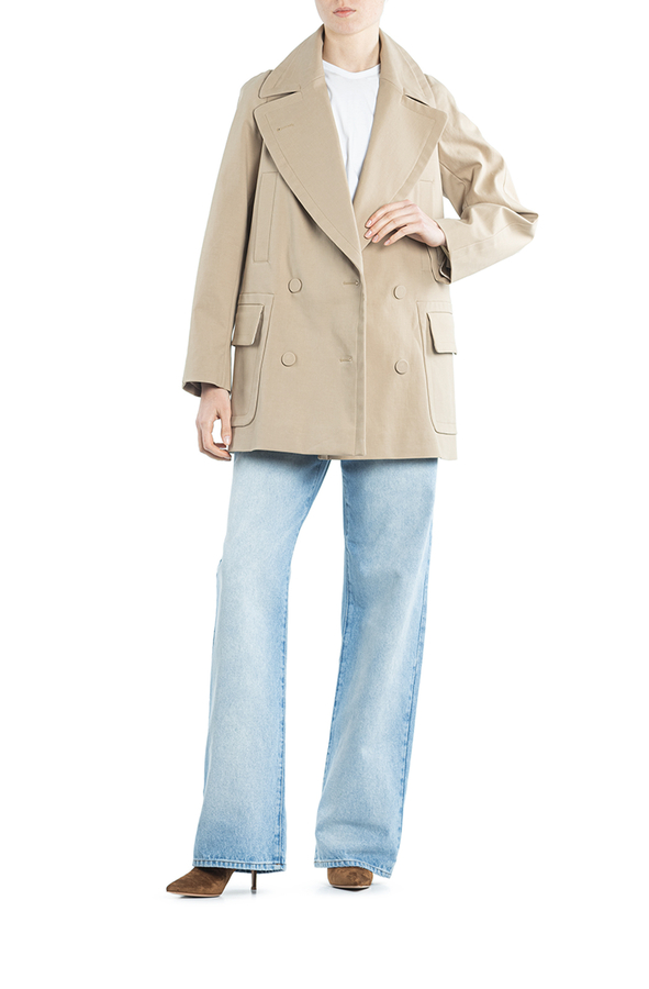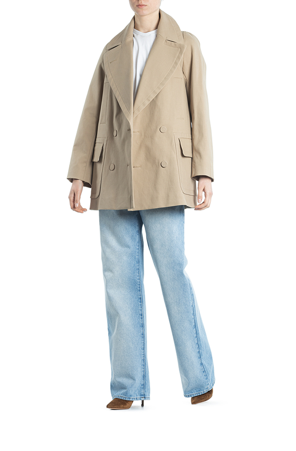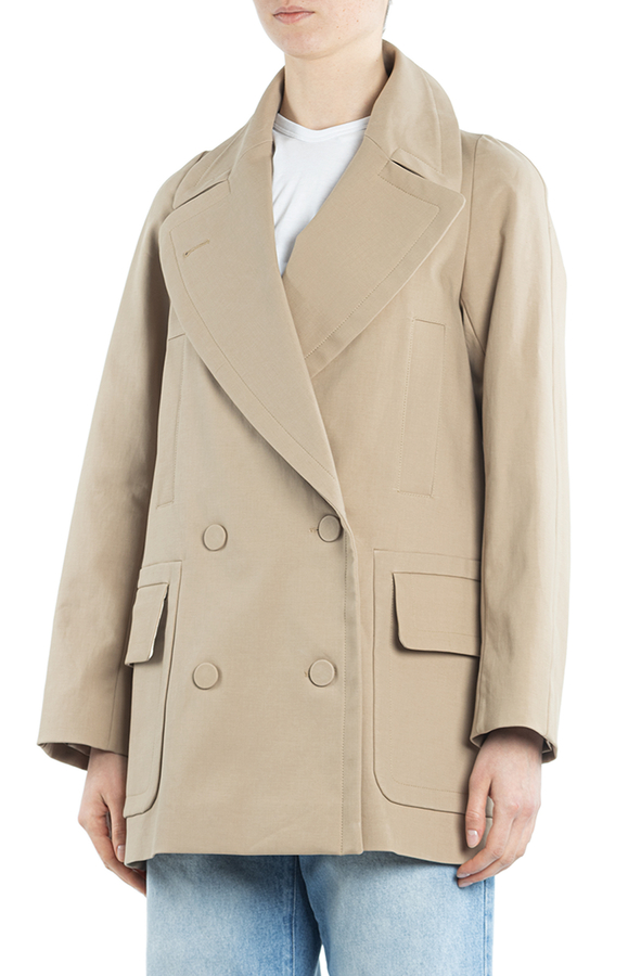 - Double-breasted short coat, notched collar, button fastening, two welt pockets and two patch pockets with flaps at the front