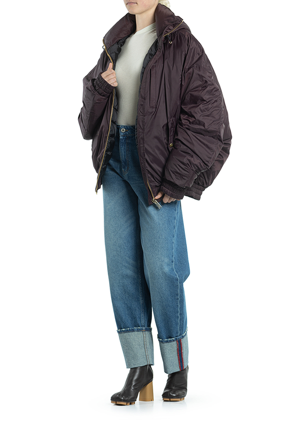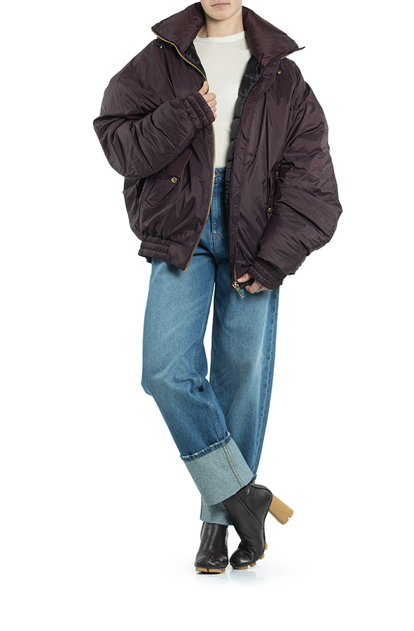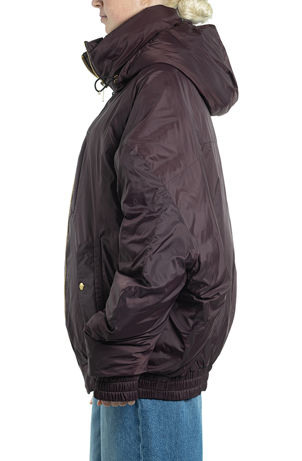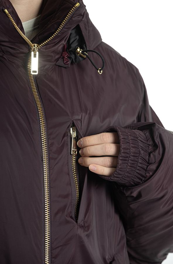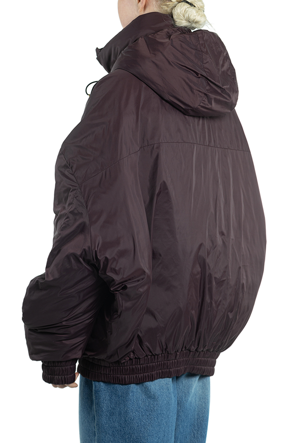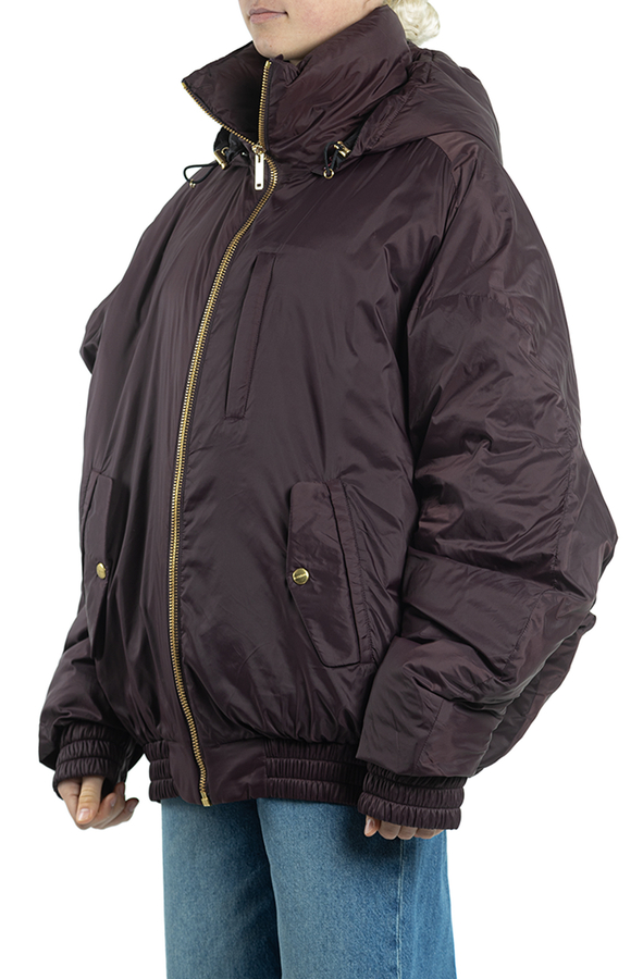 - Down jacket with a hood and drawstring, oversize model, front zip, two inset pockets.