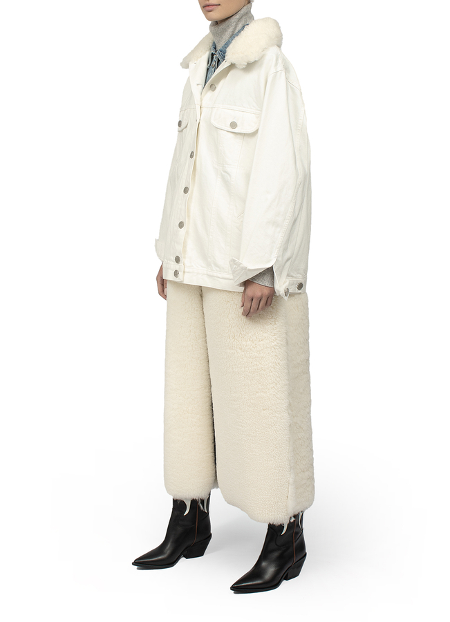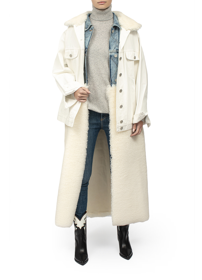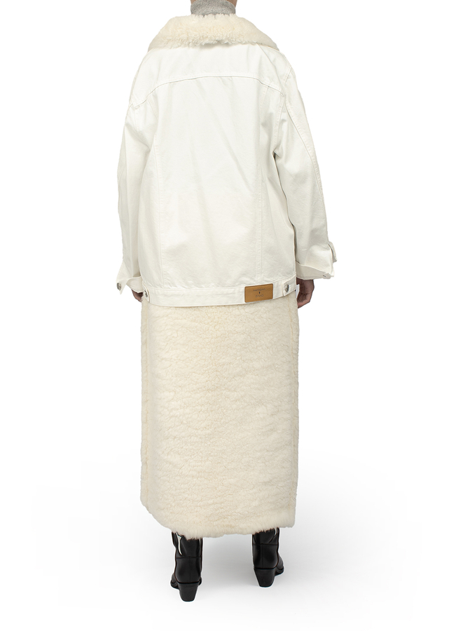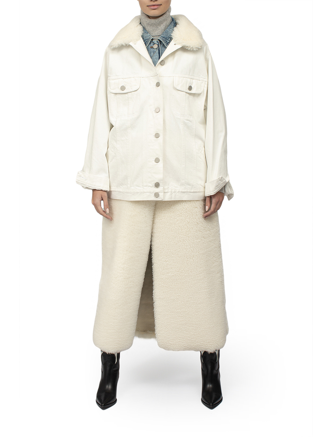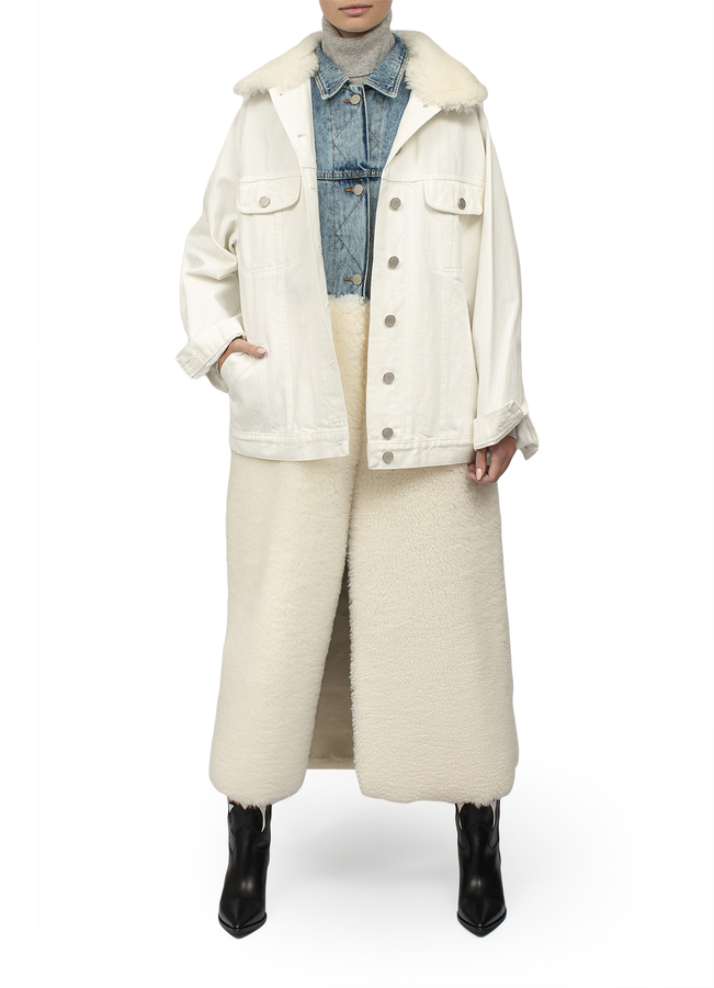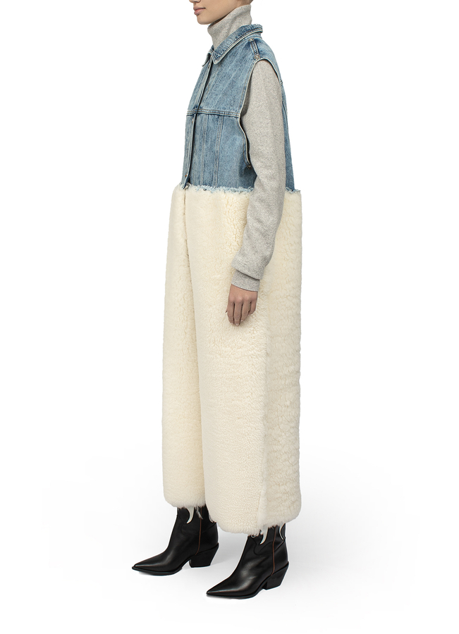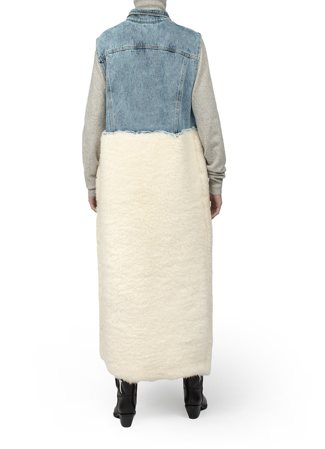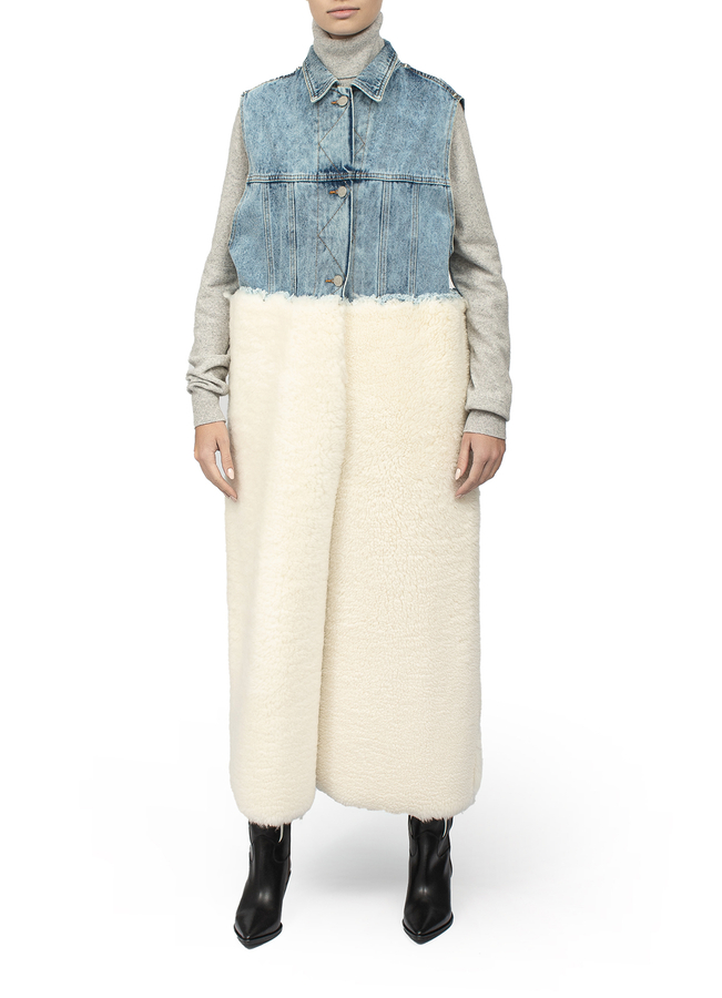 - Two-layer set of a denim jacket with a fur collar and a long waistcoat combined with denim on top and white sheepskin.