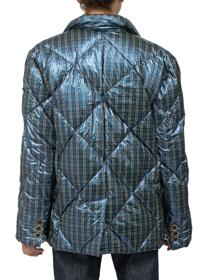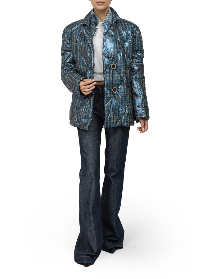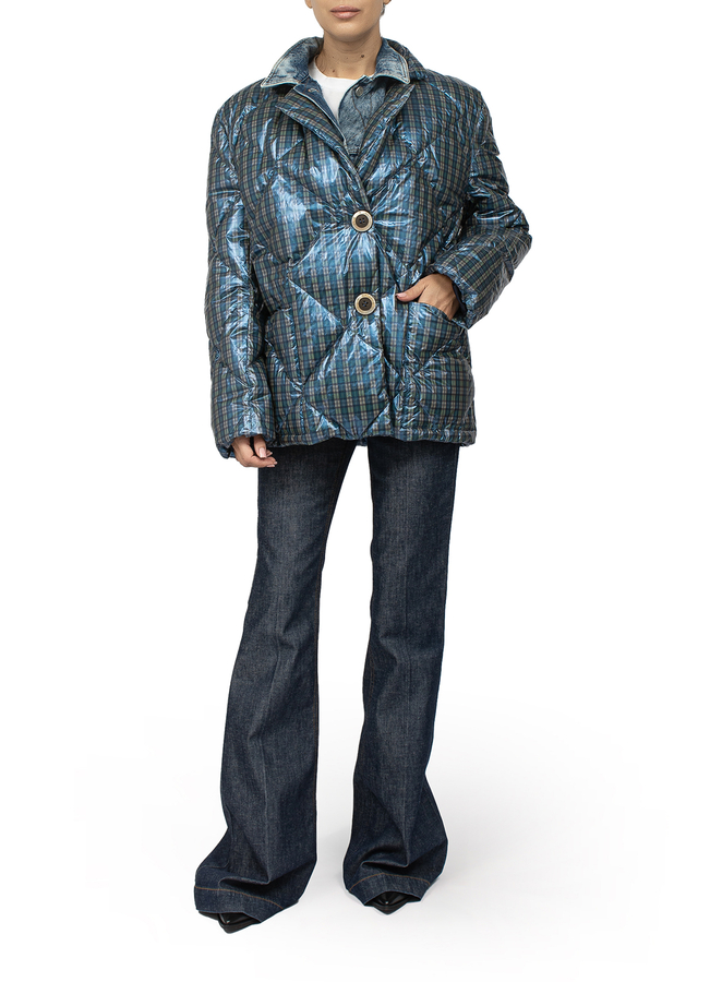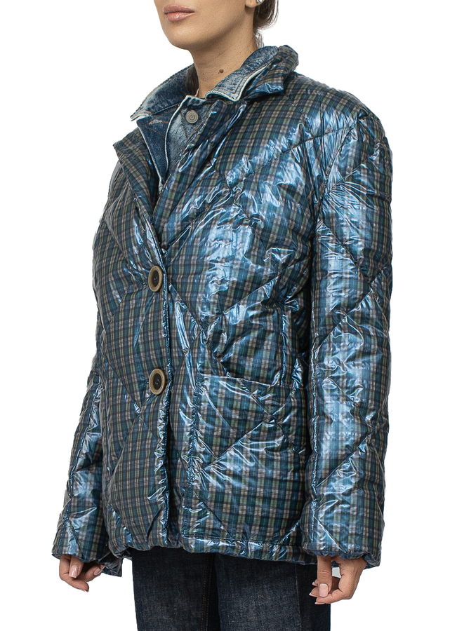 - Short quilted down jacket in a small check. Sewn short denim vest. Layered design, button fastening, long sleeves.