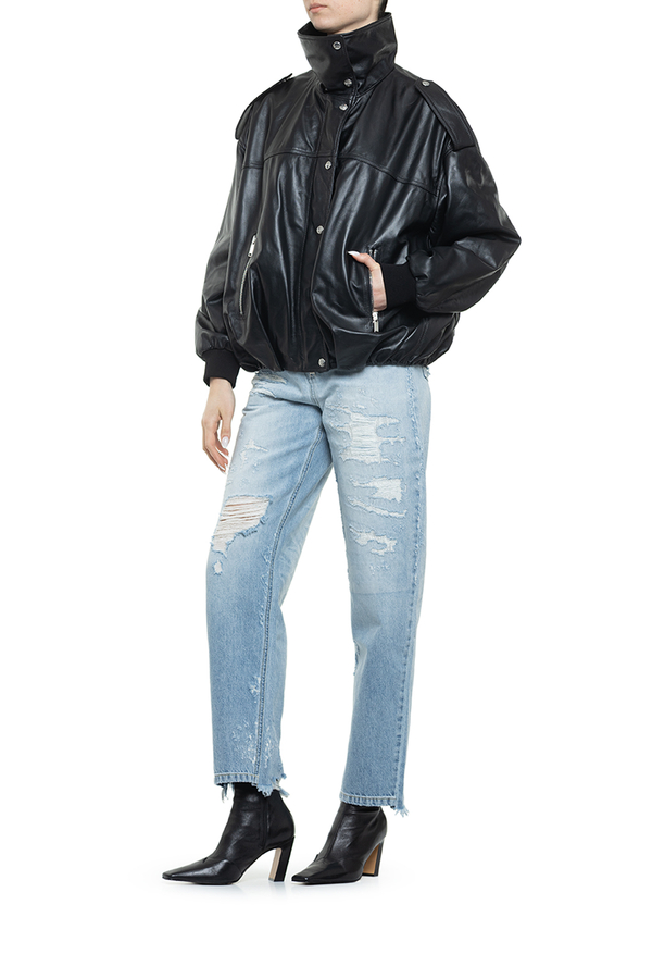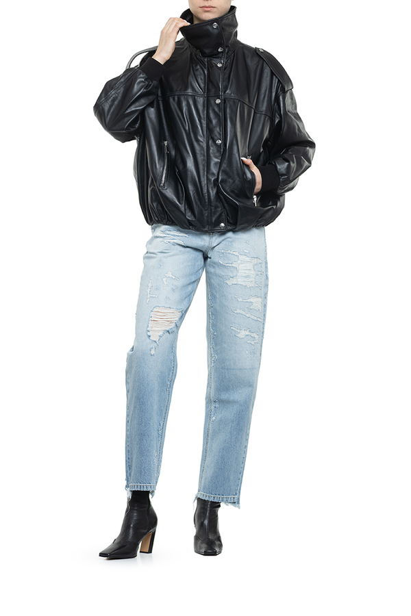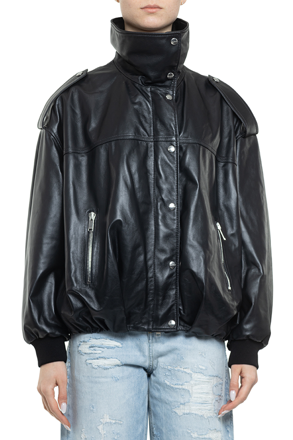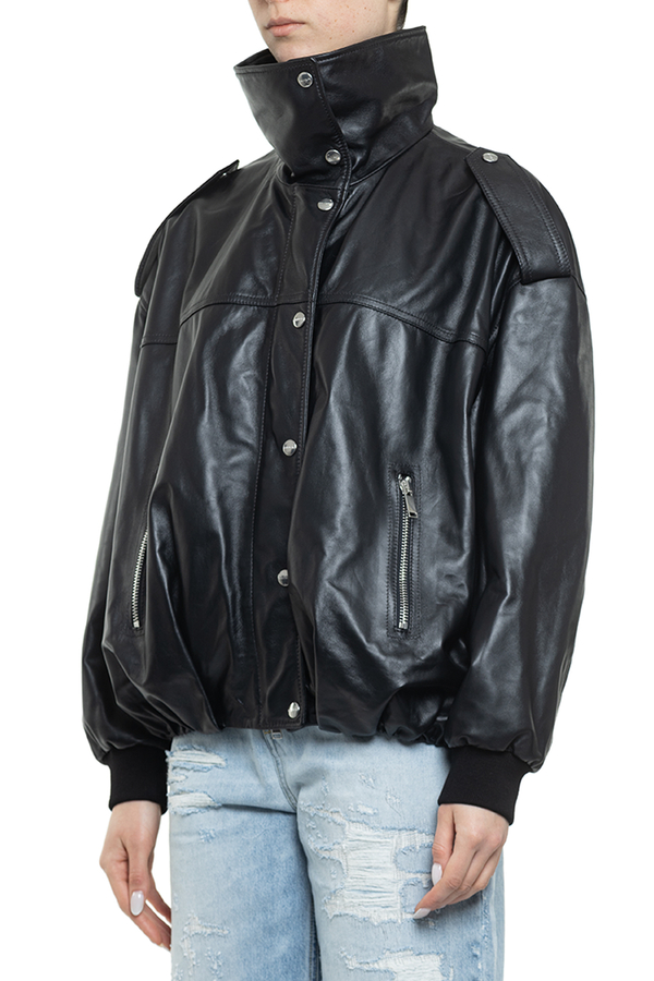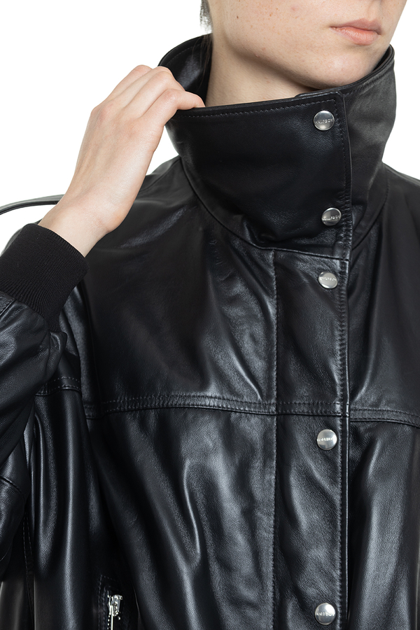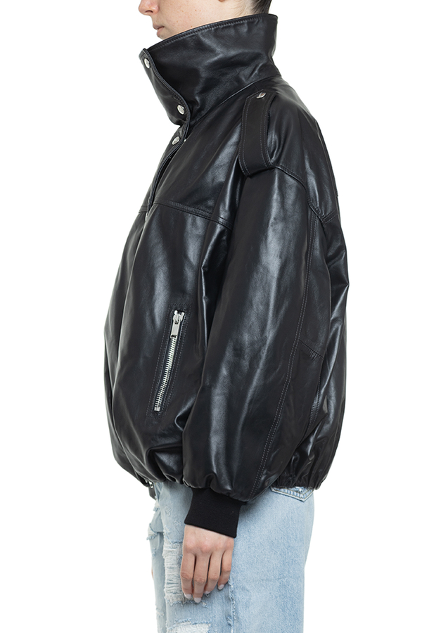 - Leather bomber jacket with dropped shoulders, elasticated hem, stand-up collar, snap button closure, two front zip pockets