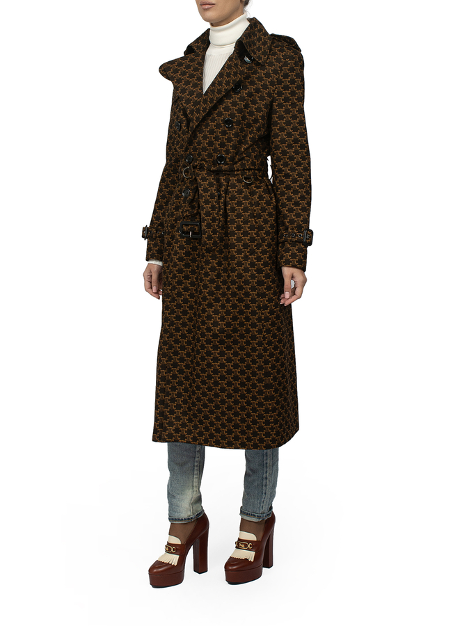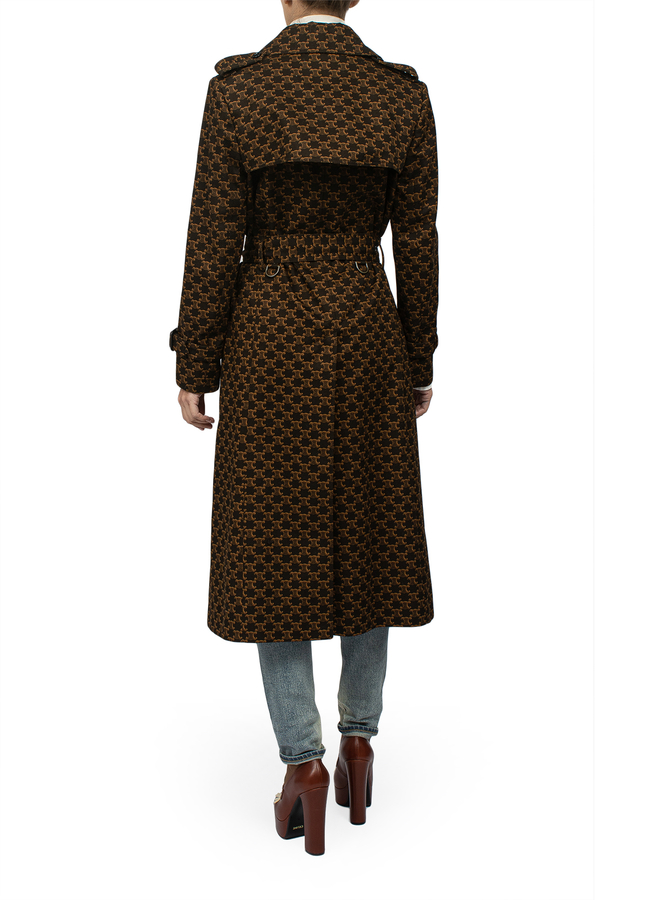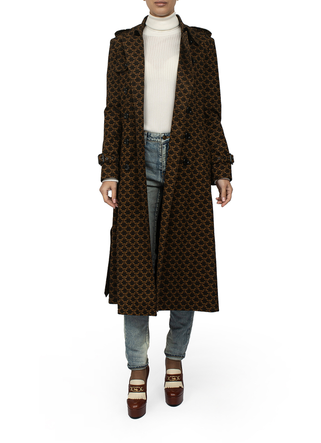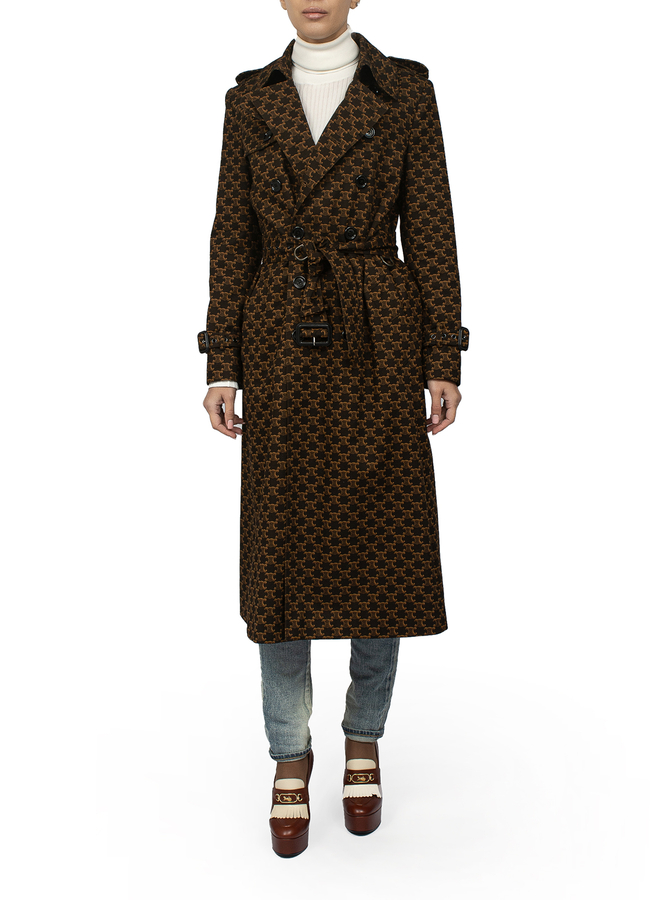 - Long trench coat with belt in logos.