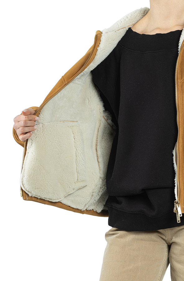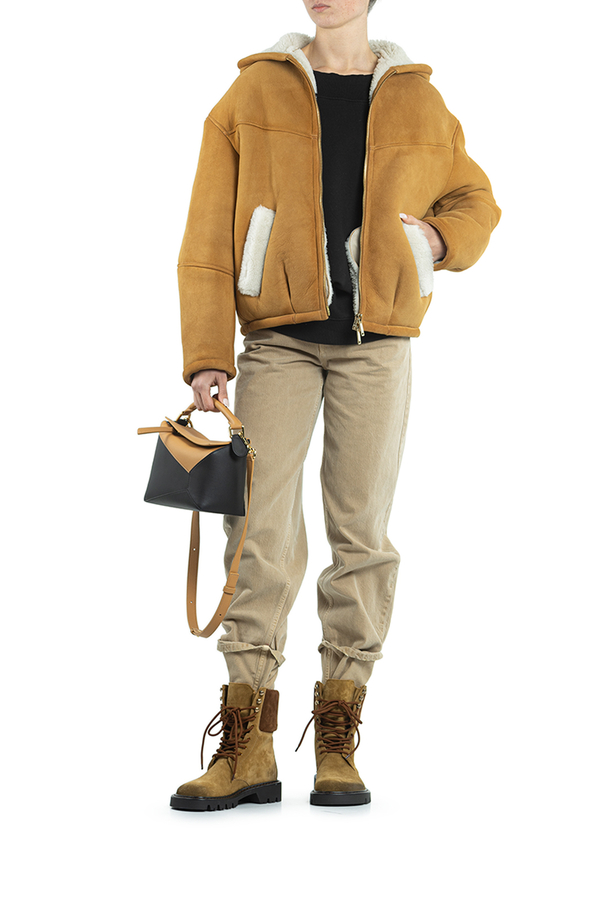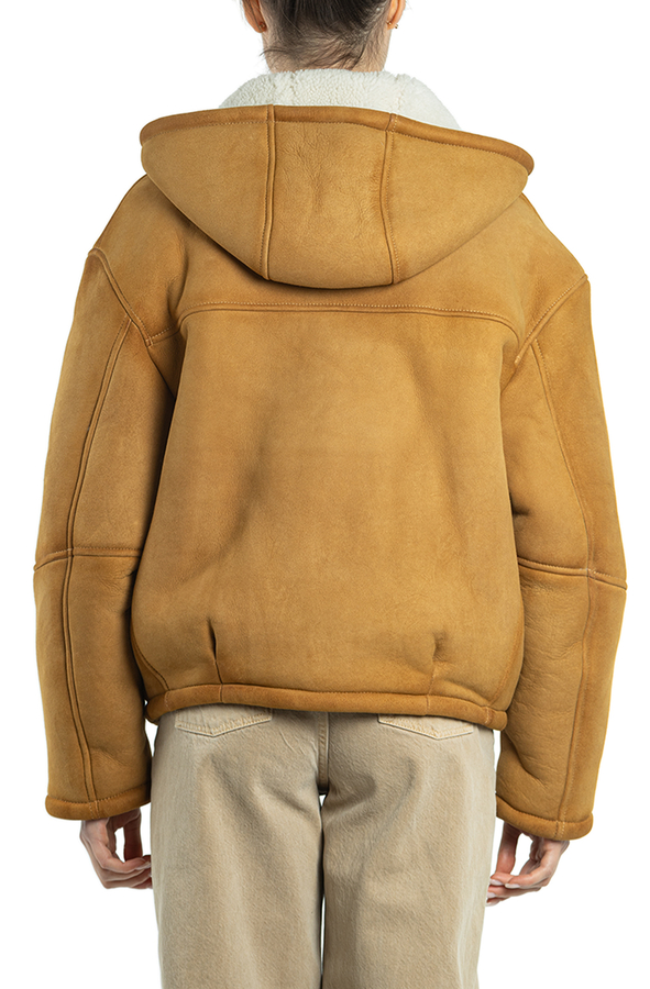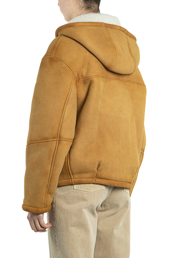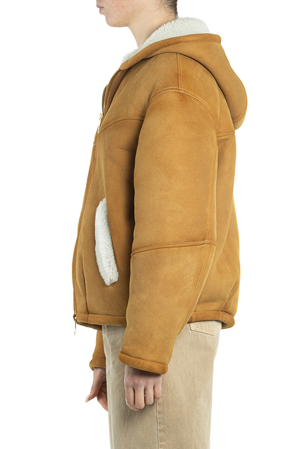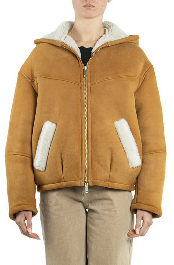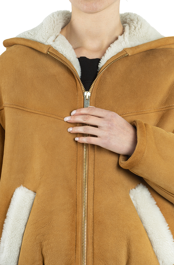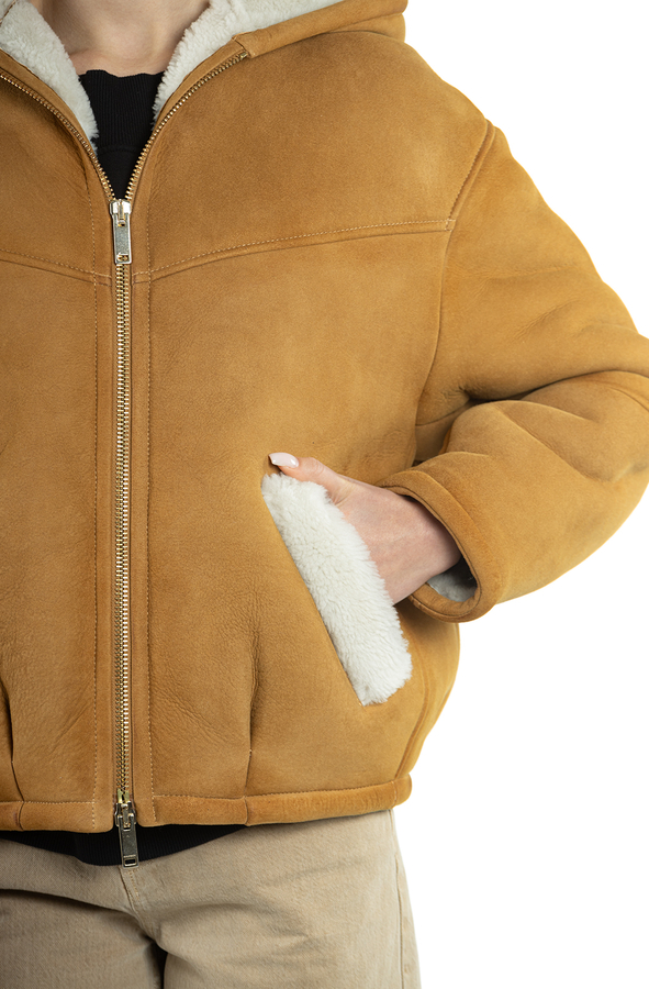- Short sheepskin coat with a hood, front zipper, two welt pockets