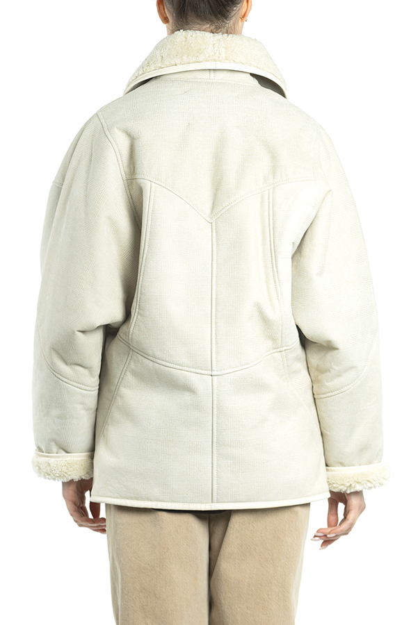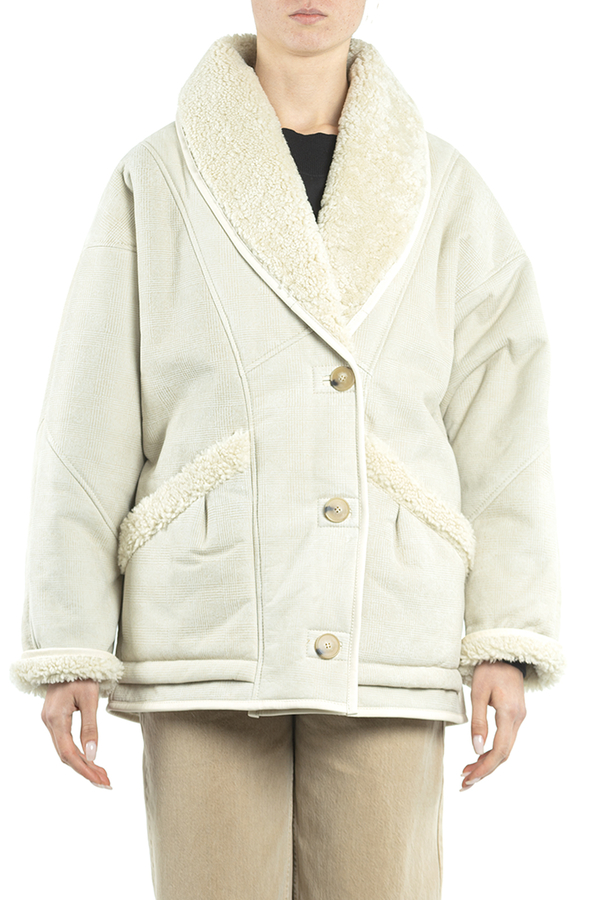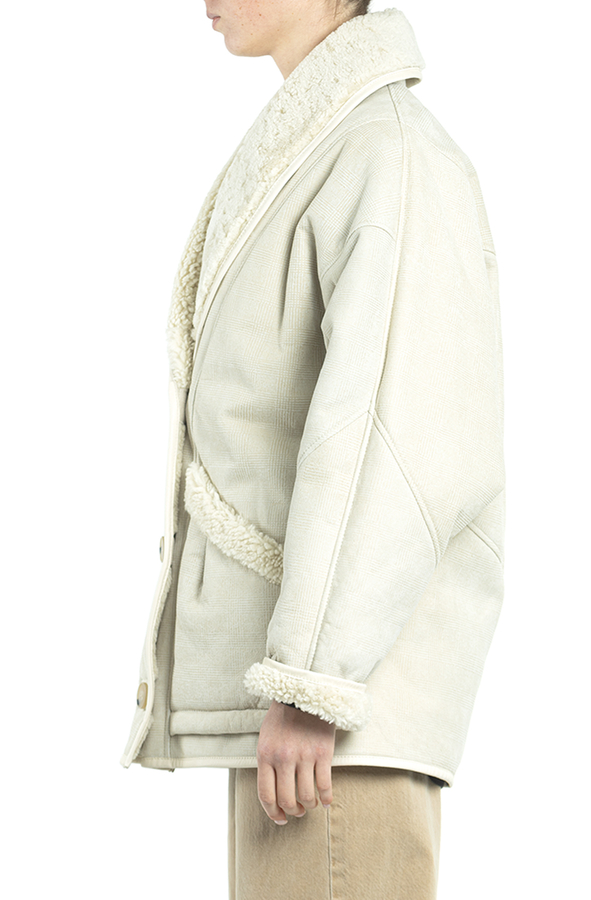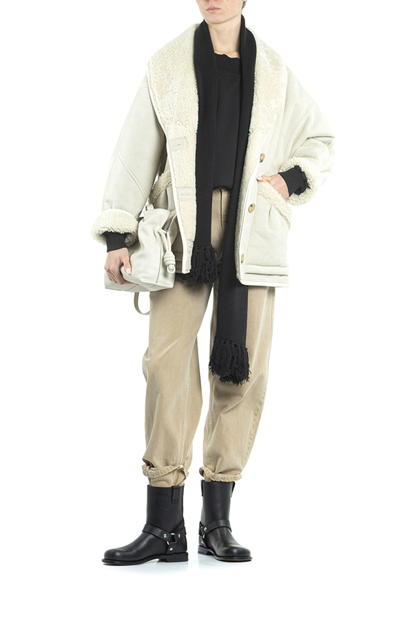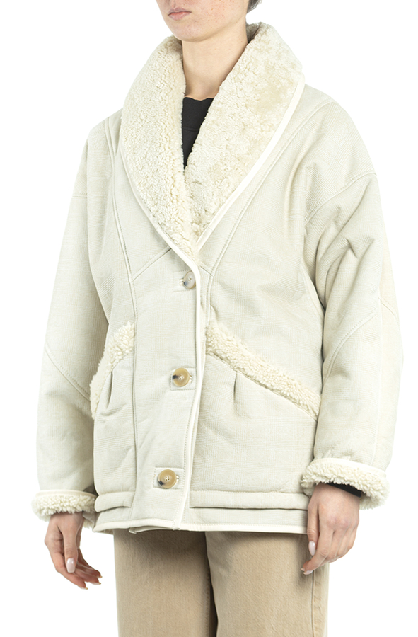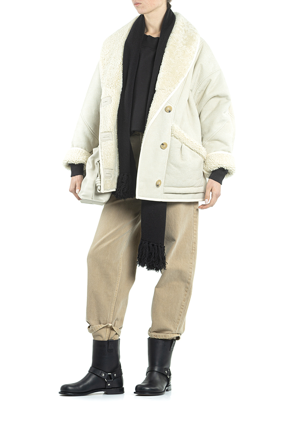 - Sheepskin coat with a turn-down collar, two patch pockets in the front, button fastening