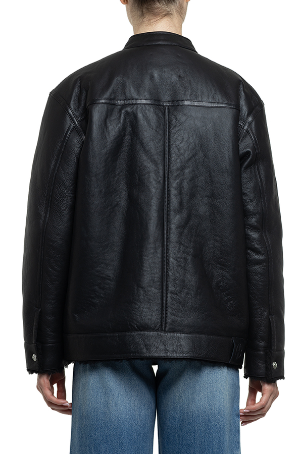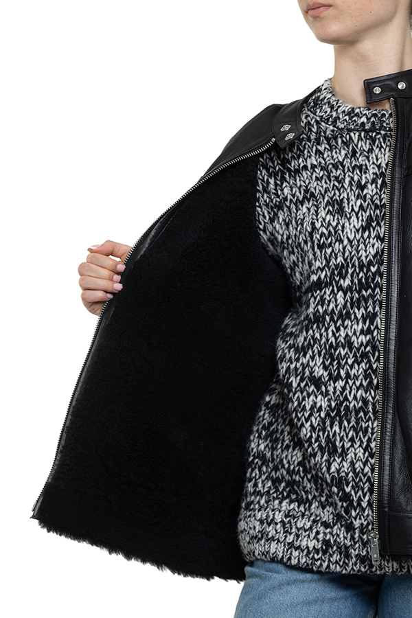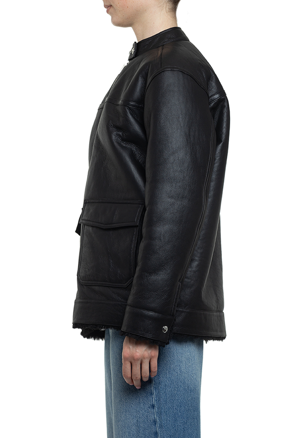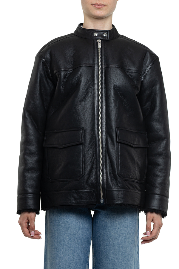 - Sheepskin coat with a round neck with buttons, a zipper, two large patch pockets in the front