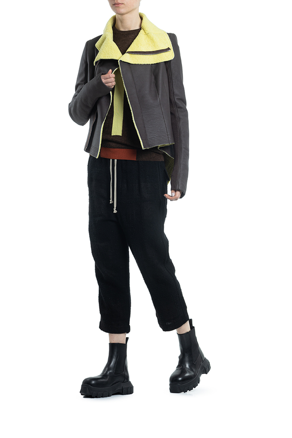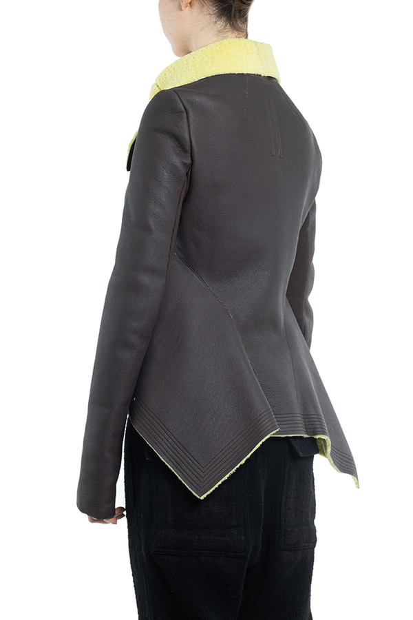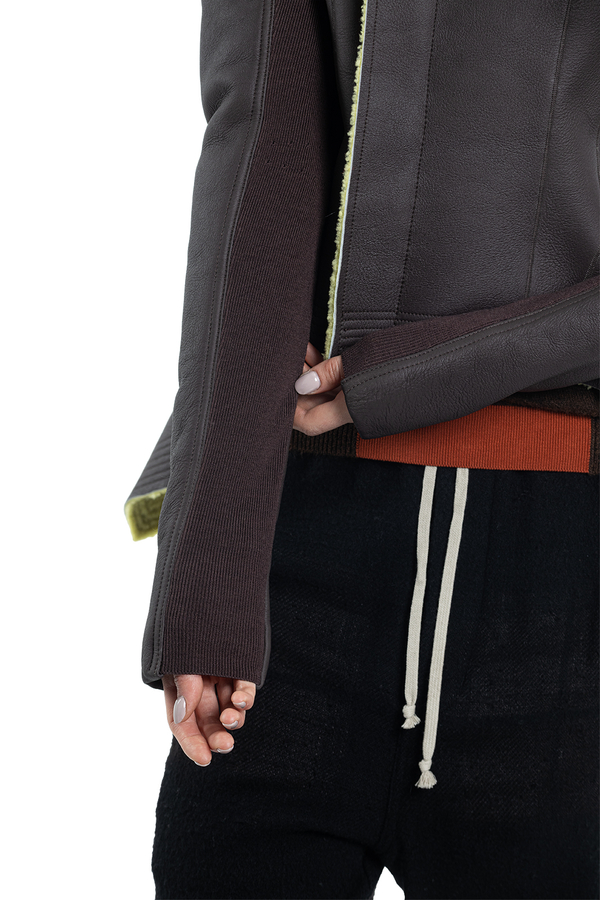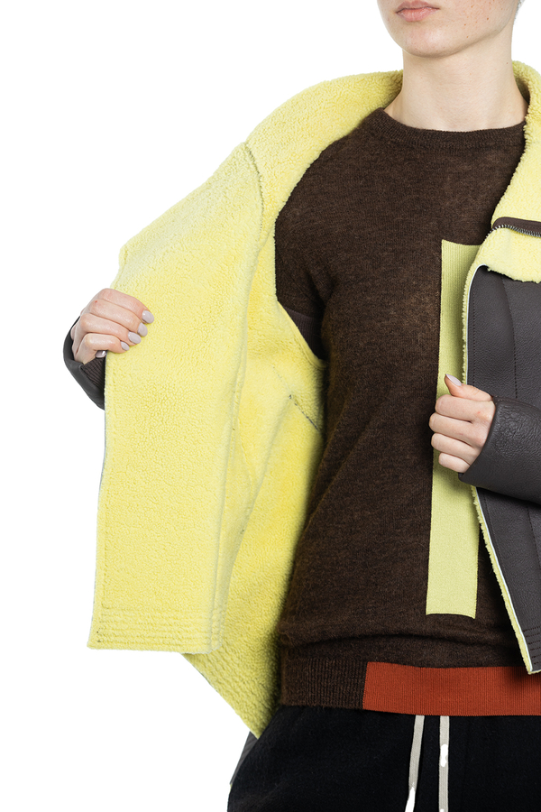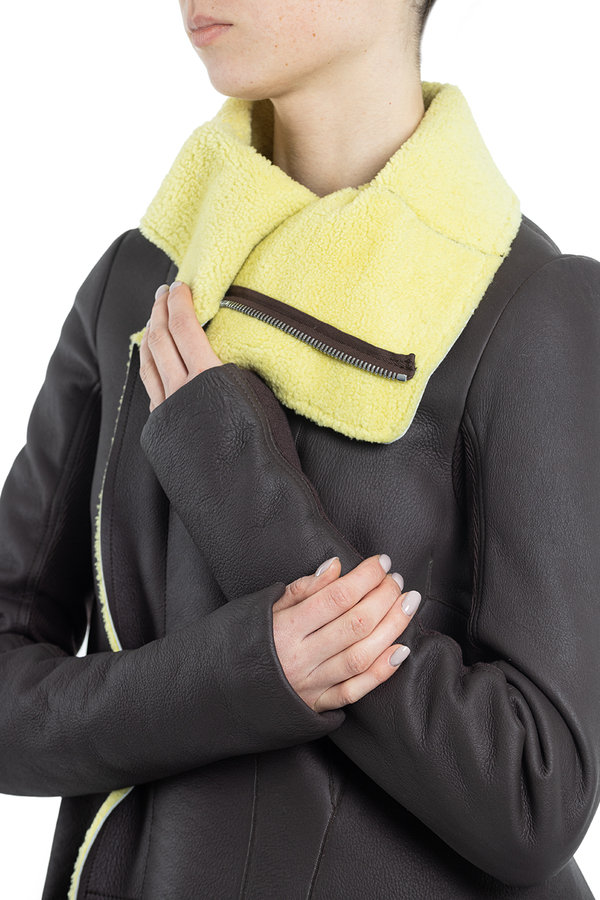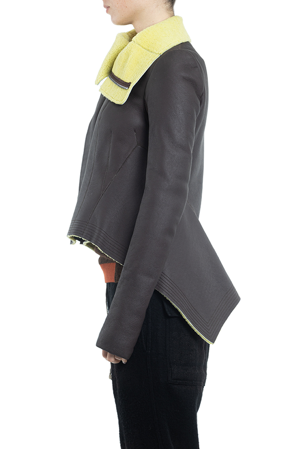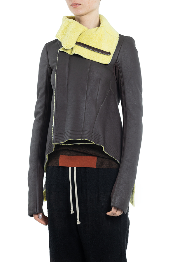 - Short sheepskin coat with contrasting fur inside. It has a suede exterior with a fur lined lining. Inserts on the sleeves are ribbed knit fabric. No pockets, zipper closure. The length is below the waist and the bottom is uneven.