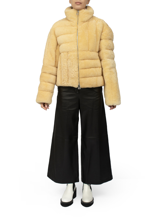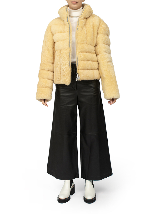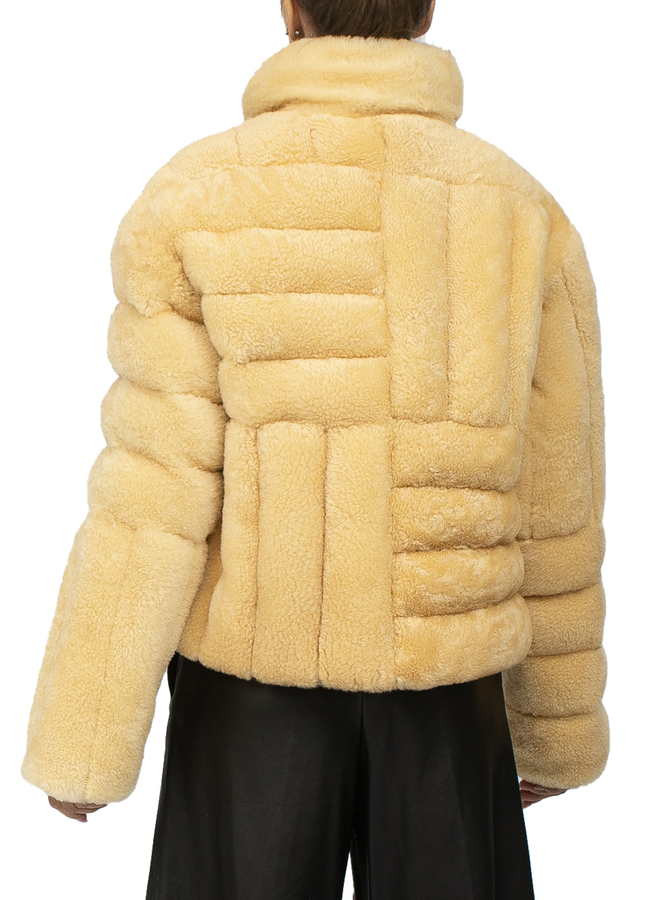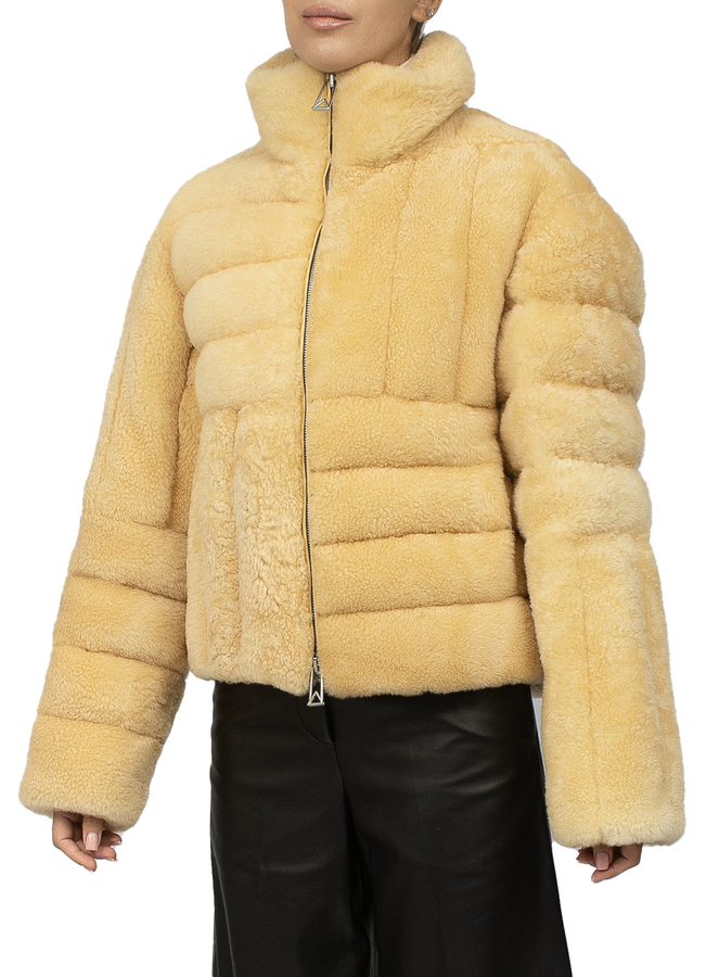 - A short fur coat made of natural fur, with long sleeves and a stand-up collar. Front zipper.