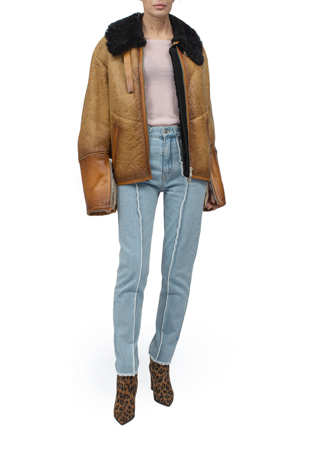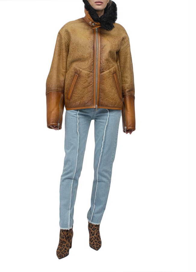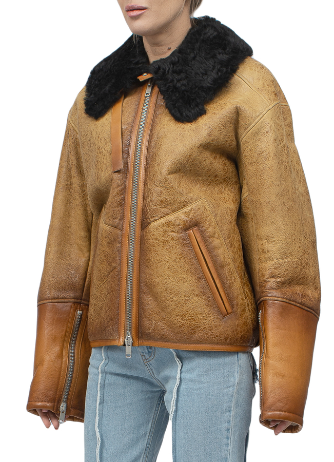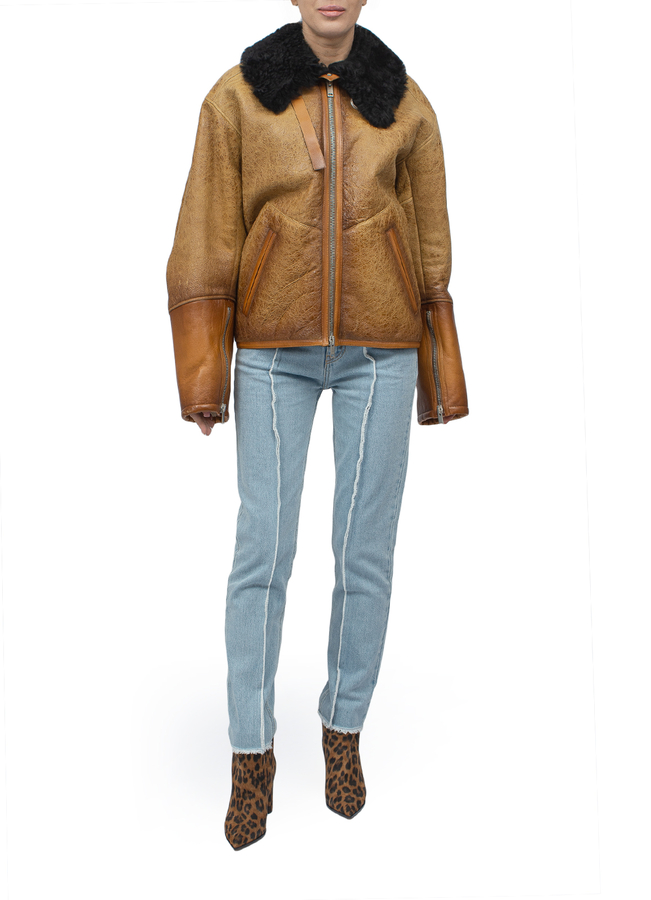 - A short sheepskin coat with fur on the collar. Zipper closure, zippers on the cuffs, two slit pockets with zippers.