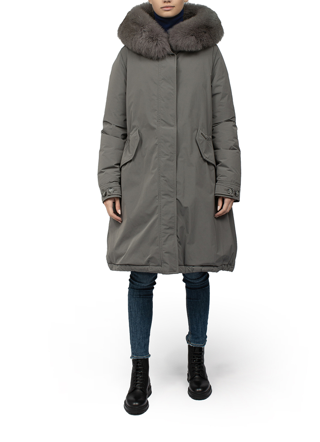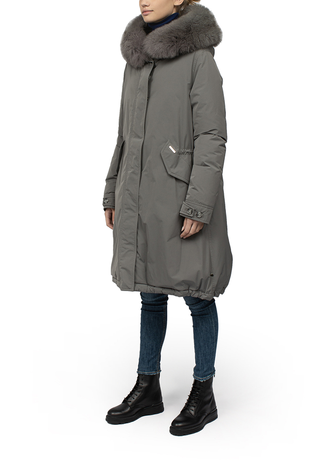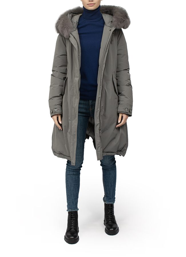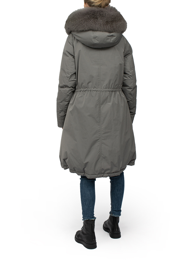 - Long parka with a hood. Drawstring on the waist, fur on the hood.