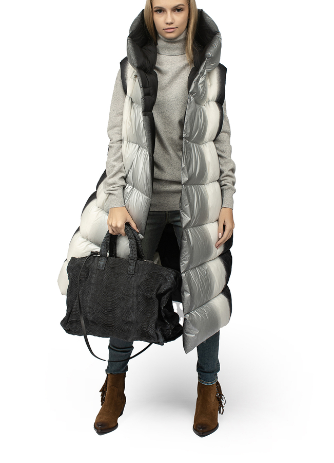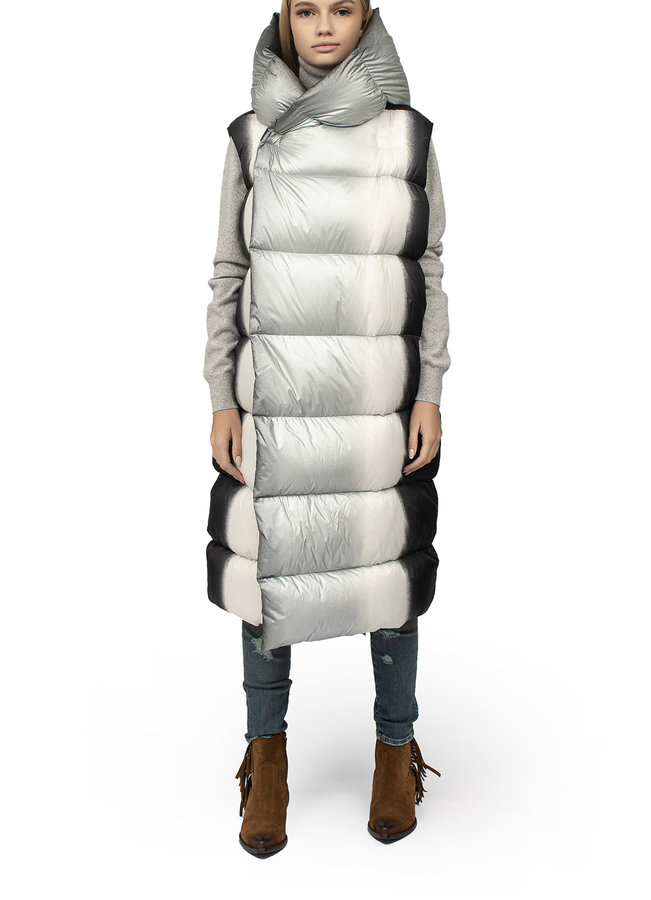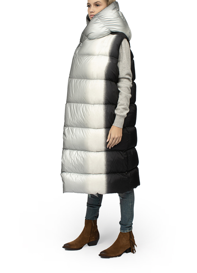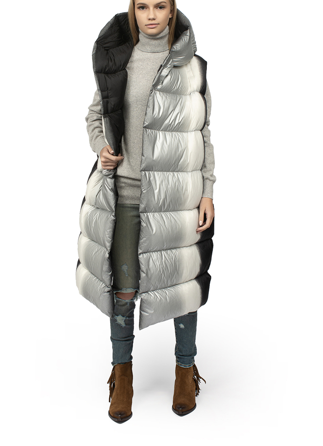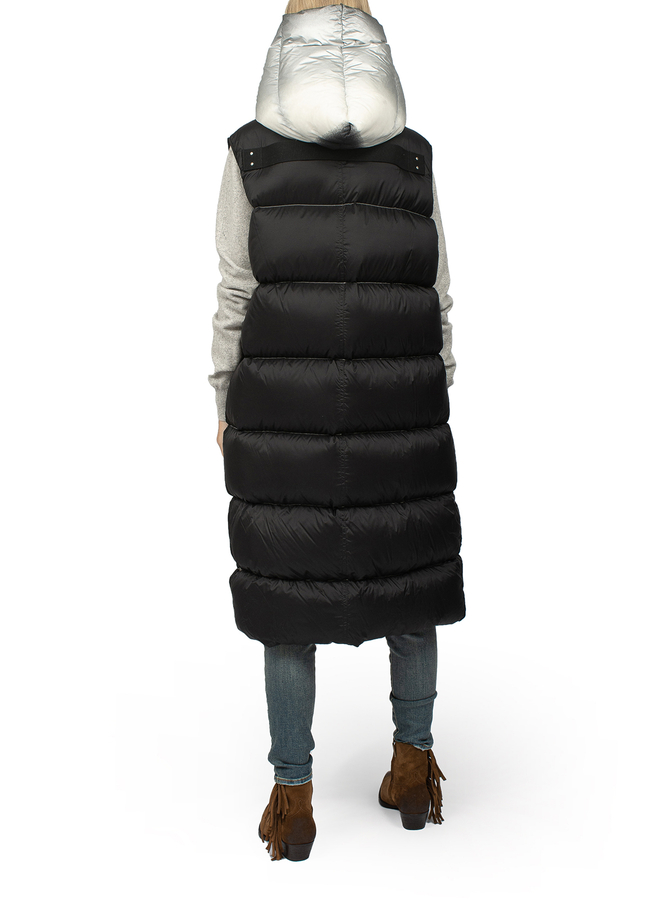 - Long vest with a hood. Featuring a quilted design, duck down padding, a concealed top fastening and an asymmetric hem. silver fabric insert at front.