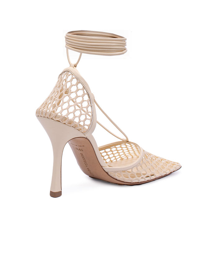 - Sandals with stilettos, braided top, webbing at the ankle.