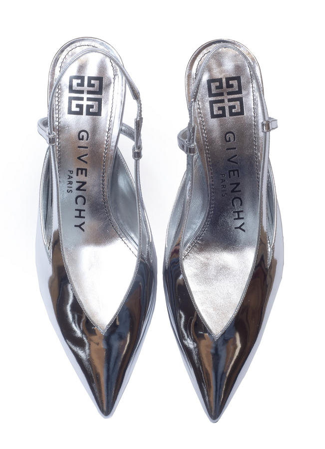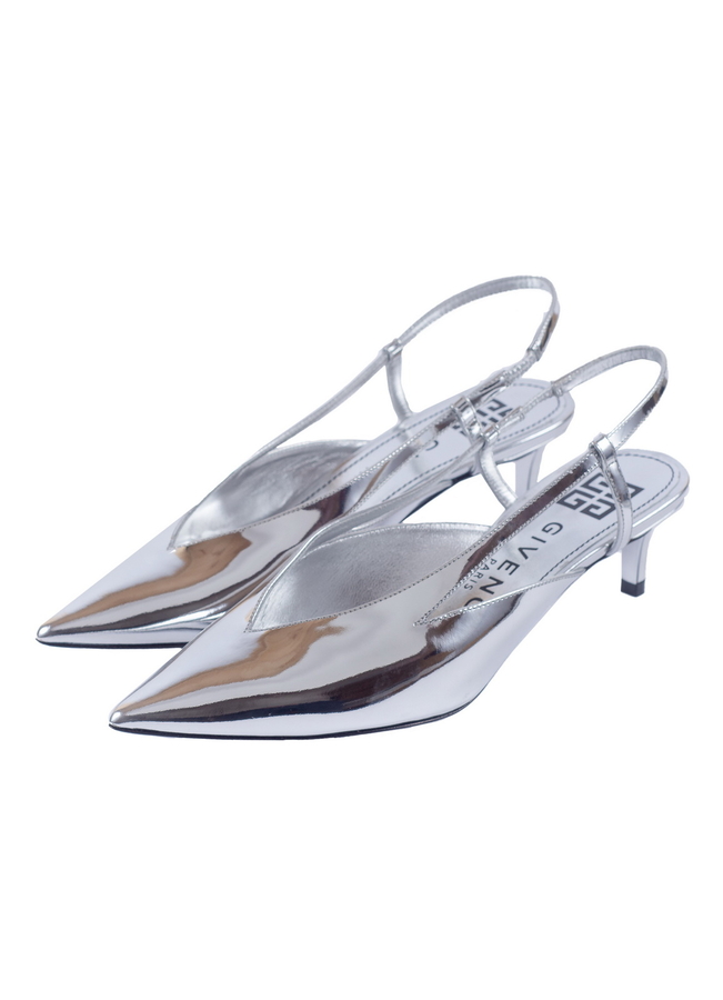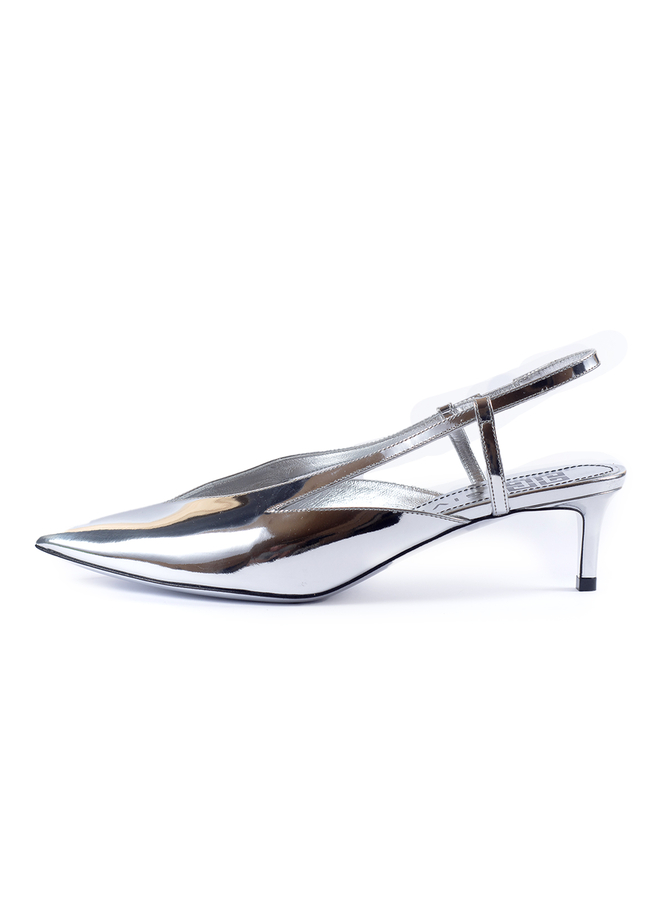 - Pointed toe, branded insole, cut-off detail, elastic heel strap and mid-height heel.