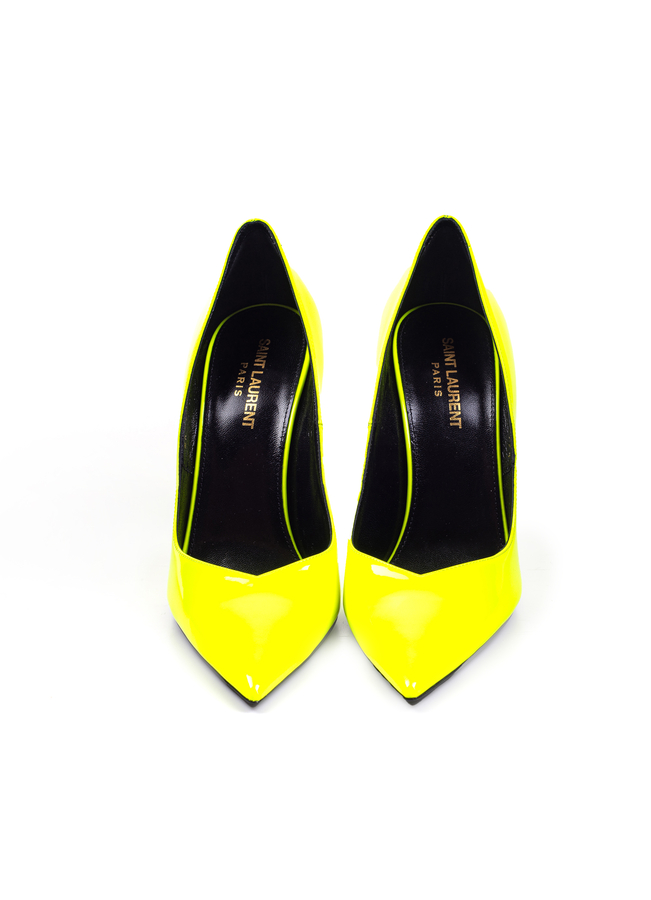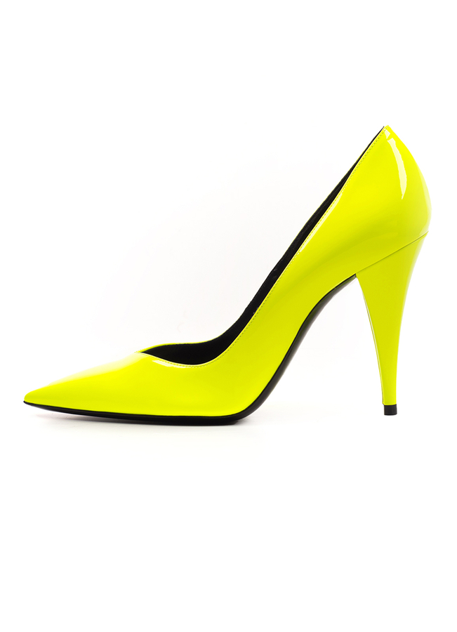 - Leather pointed toe shoes, slip-on style, metallic sheen, logo insole, tapered high heel and leather sole.