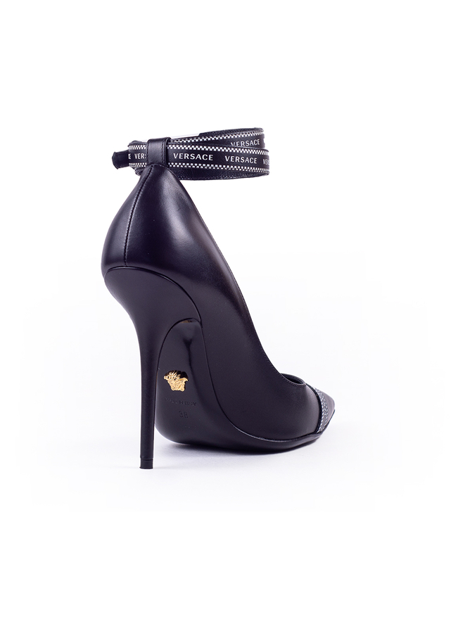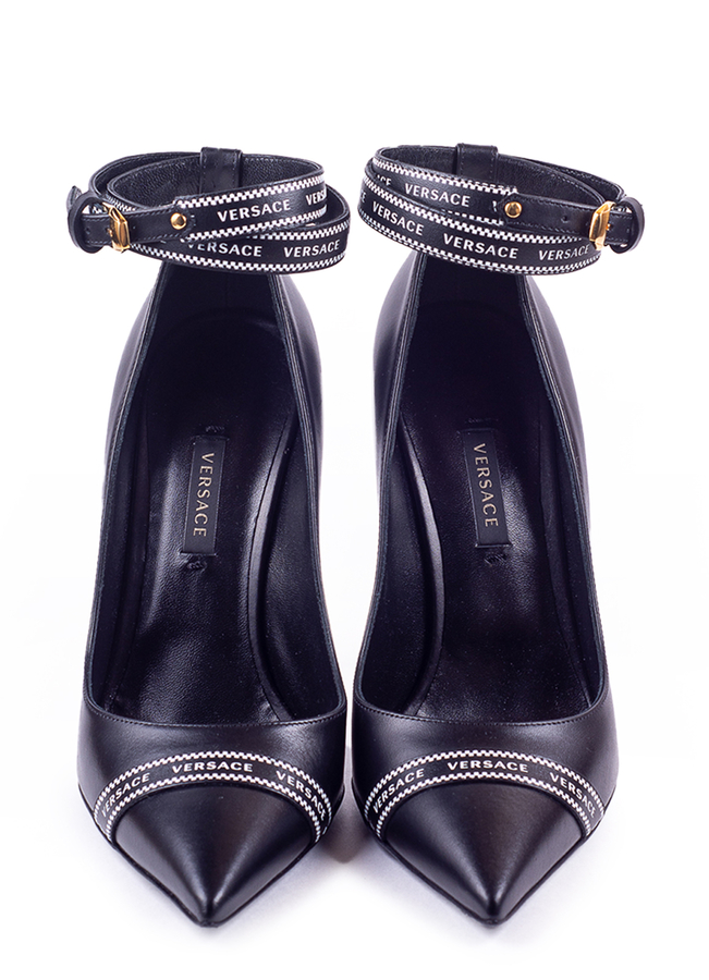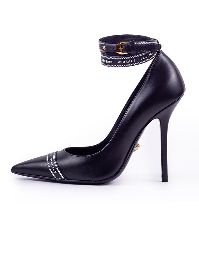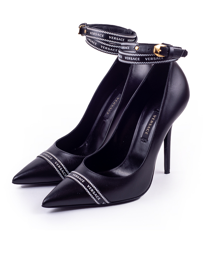 - Shoes with a narrowed toe, high heels. Made of soft matte leather, with a white graphic print logo. With a logo on a narrow jumper on the union and a strap on the ankle.