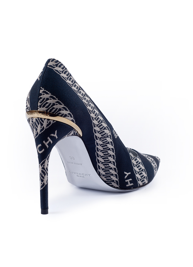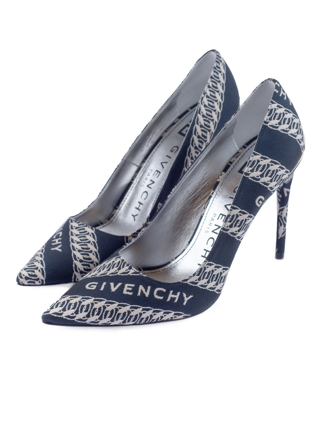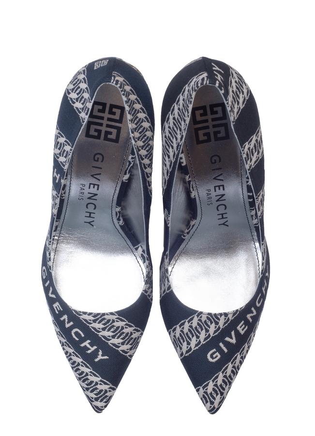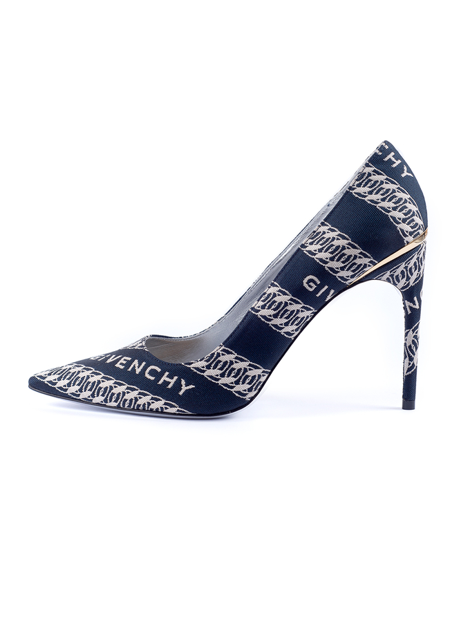 - Fabric shoes with a company logo. Pointed sock, stiletto heel and gold fittings.