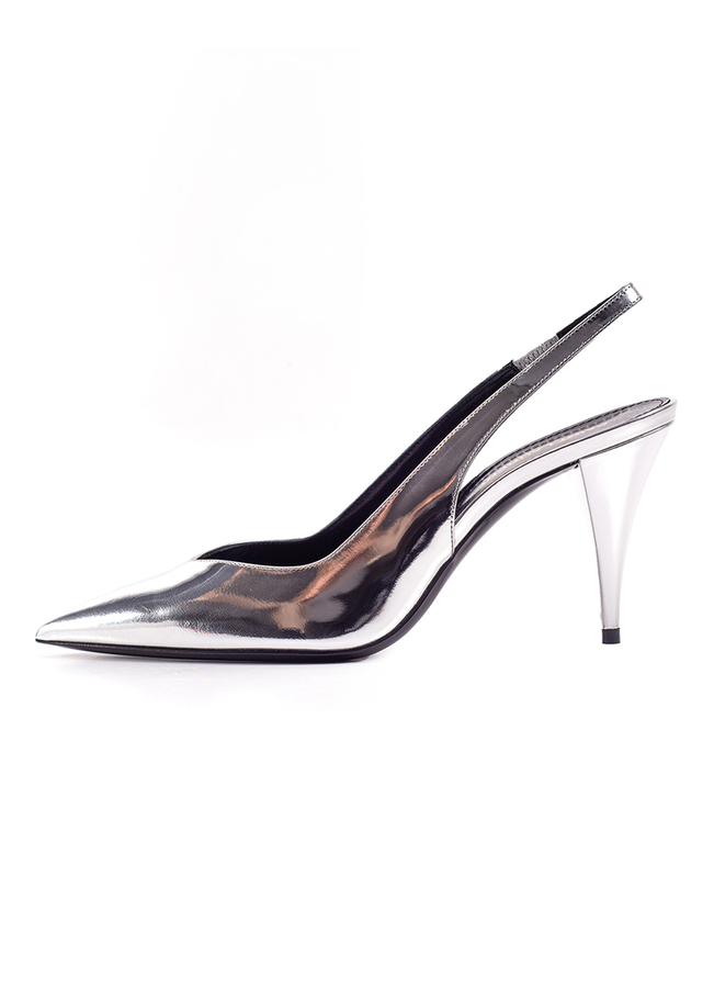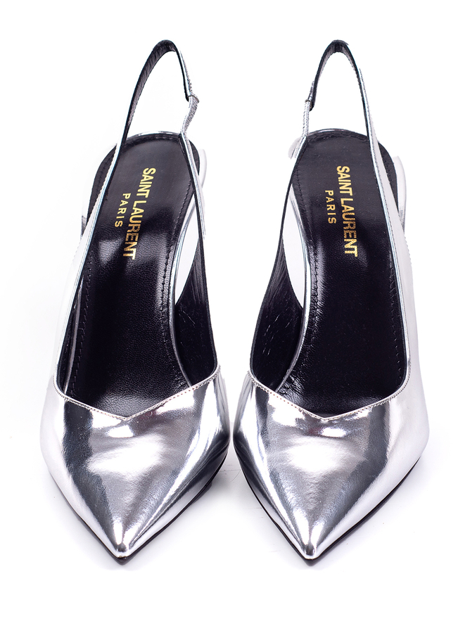 - Kiki slingbacks from Saint Laurent in shiny silver leather with pointed toe, 85-milimitre cone heel, V-cut vamp, elastic heel strap and a leather sole