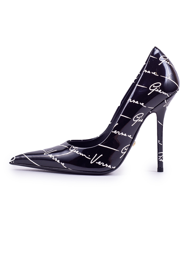- Varnished shoes with a logo. Pointed sock, branded insole and high heel.