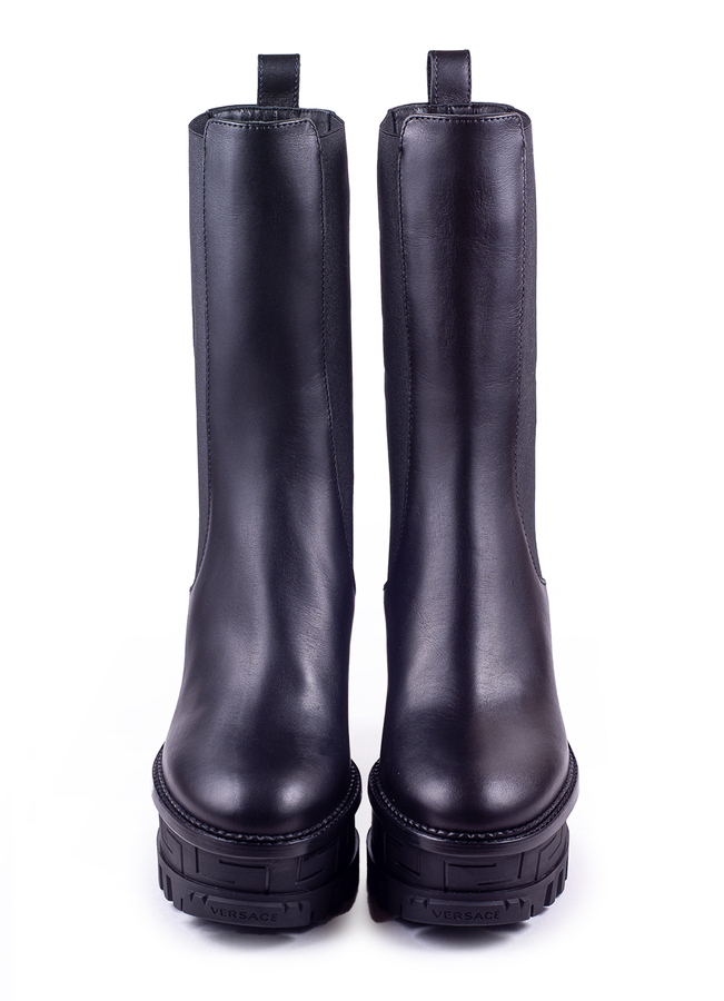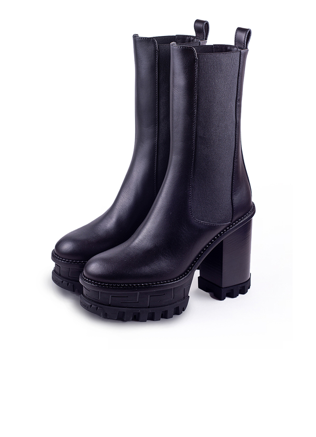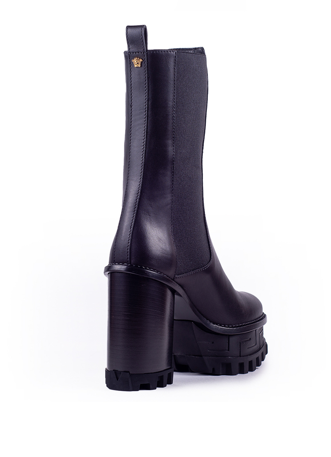 - High-heeled platform ankle boots. The iconic Greca ornament, almond-shaped sock, elastic side panels, velcro fastener on the front, Medusa print, platform sole and high heel.