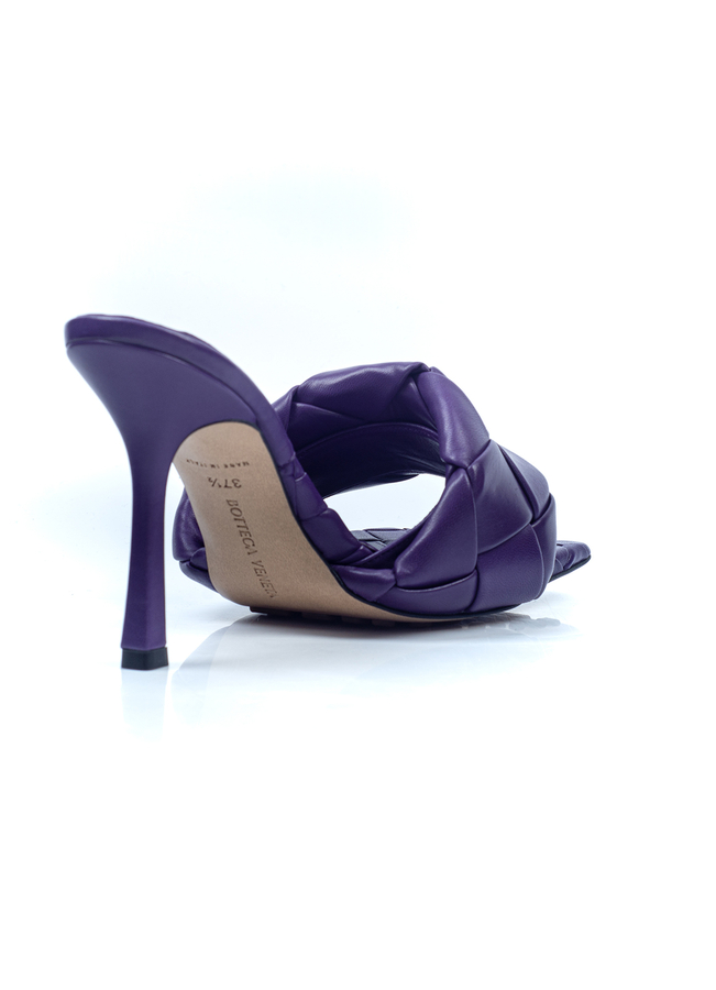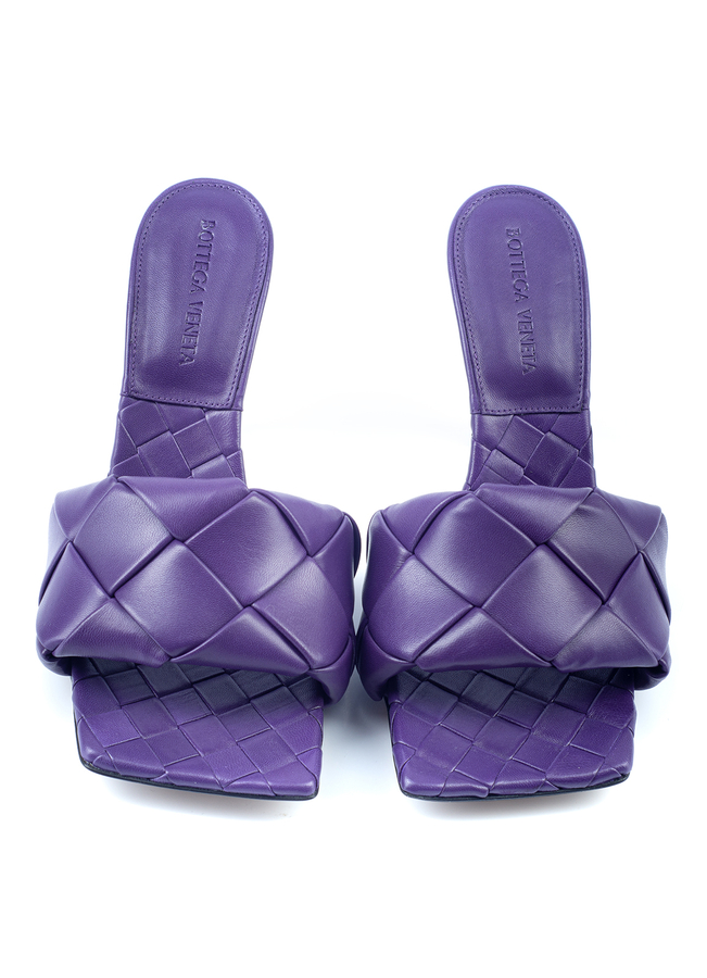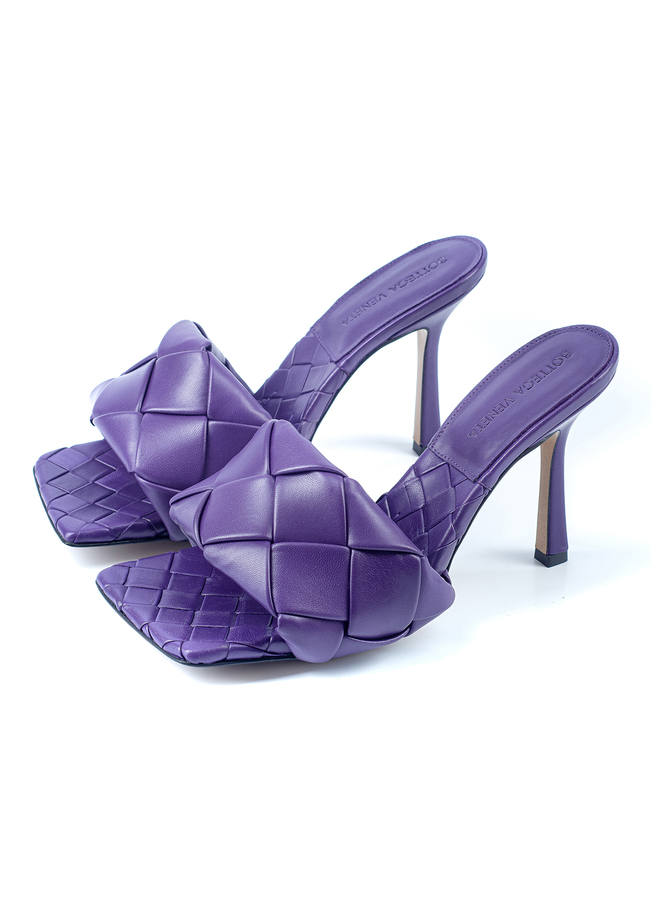- Leather heel mules. Open square sock, the top is decorated with a large weave Intrecciato
