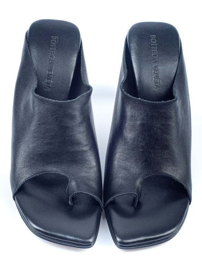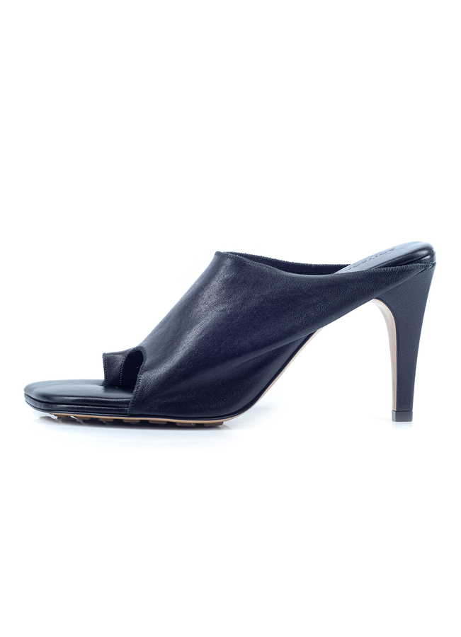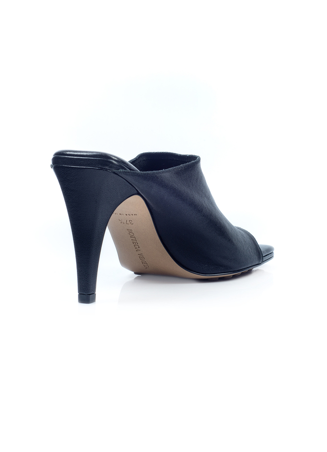 - Stretch Nappa leather mules in black, high vamp, extended toe loop, super soft unlined upper, squared toe, padded insole, cone heel, rubber-injected leather sole