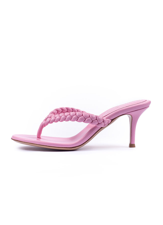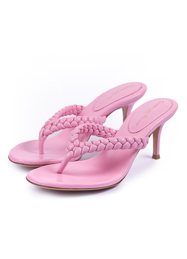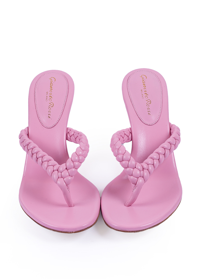 - Round toe leather mules with Y-shaped braided strap, mid-stiletto heel. Made from soft leather.