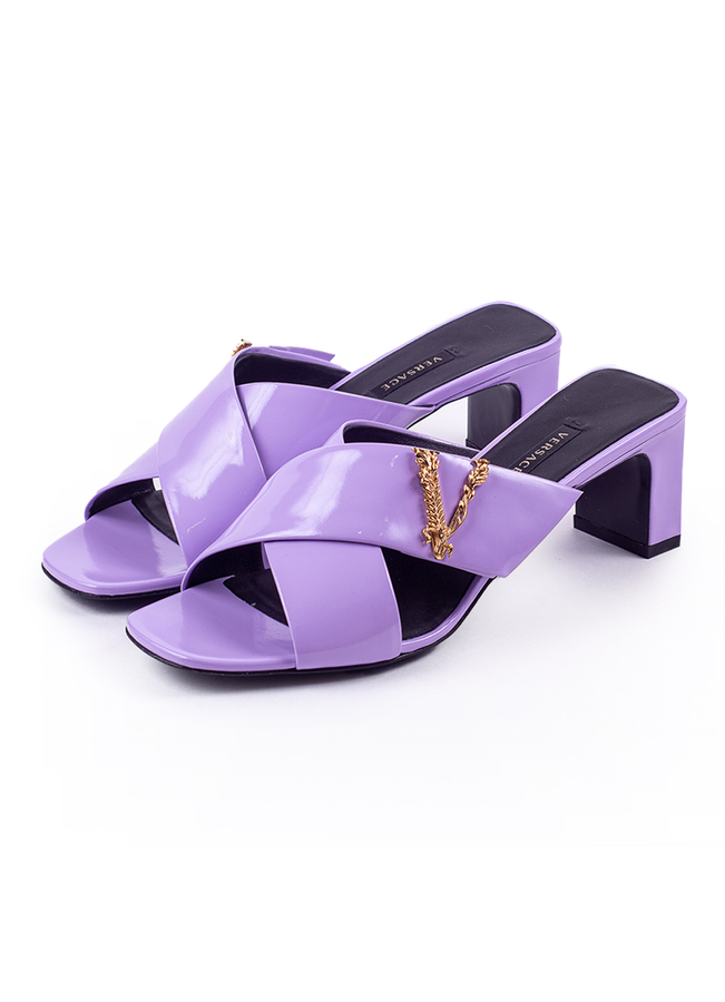 - Lavender patent leather mules with decoration shape of gold letter V. Intertwined straps, without clasp, medium heel.