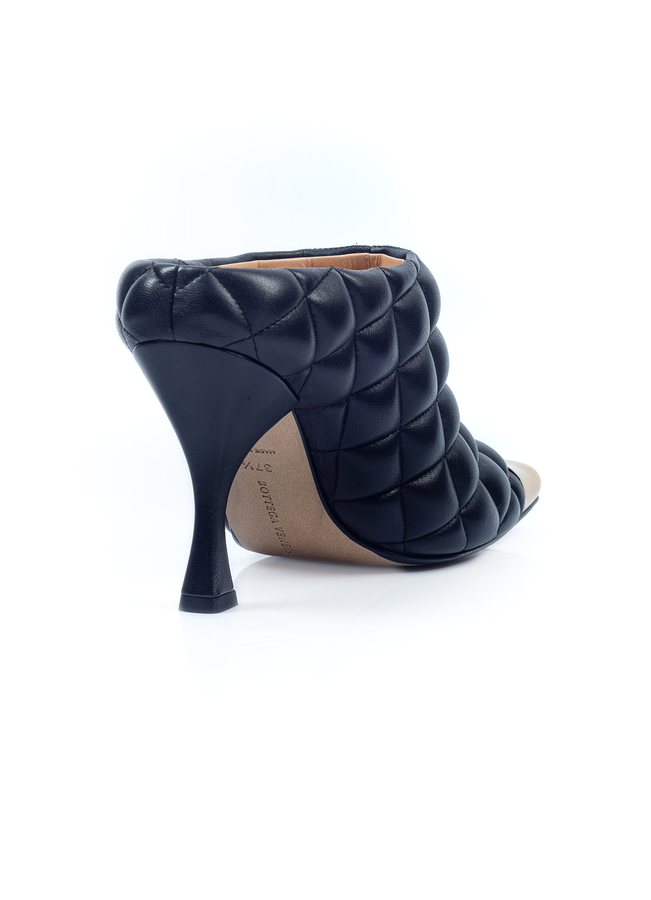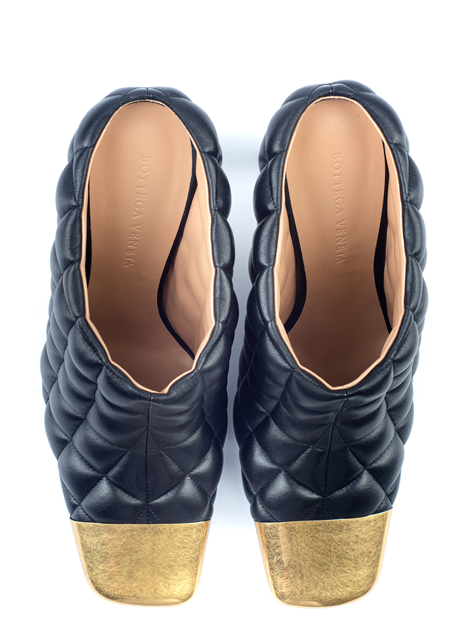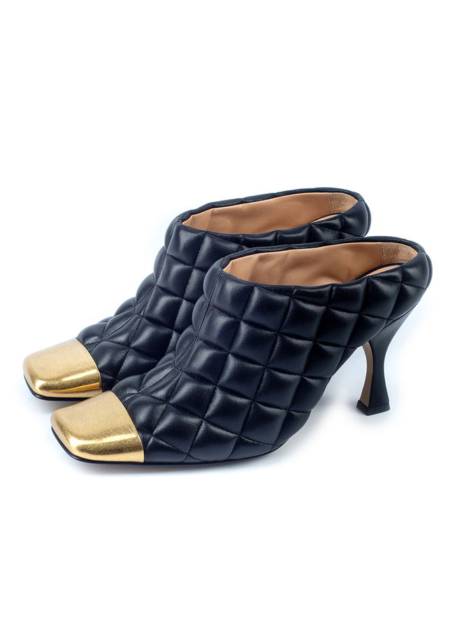 - Soft matte quilted leather Mules with square toe and gold-tone inlay. Model with a figured heel and closed toe.