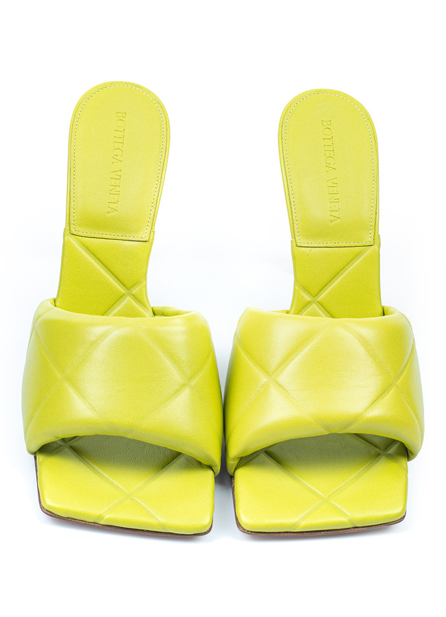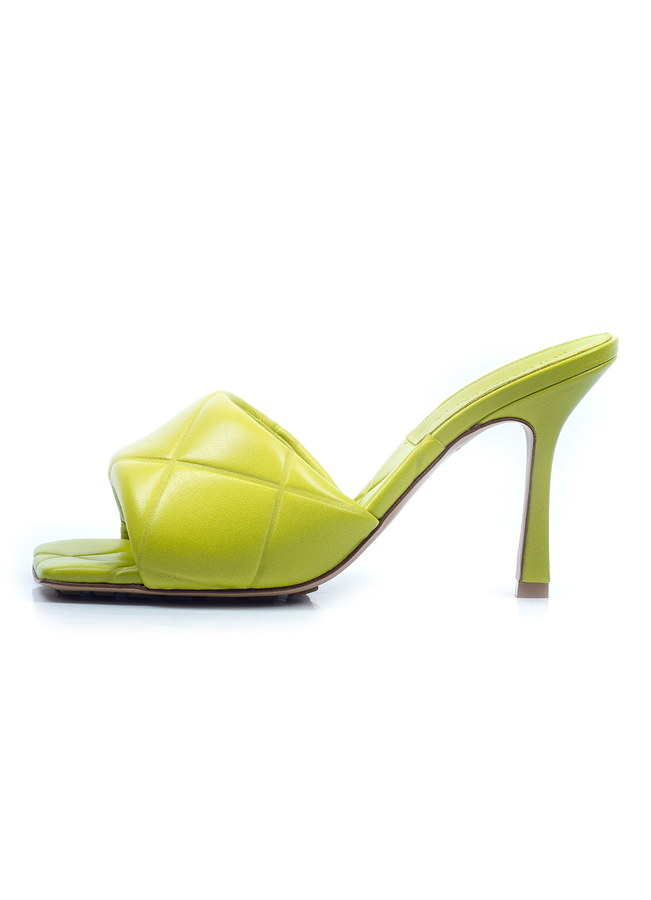 - Heeled mules with square open toe. Insole with a logo, without a fastener.
