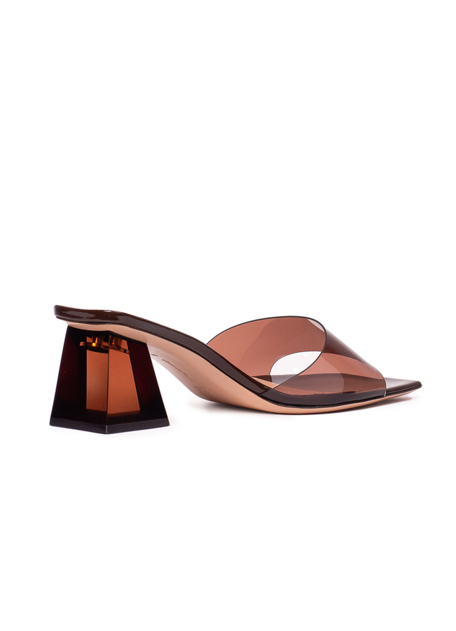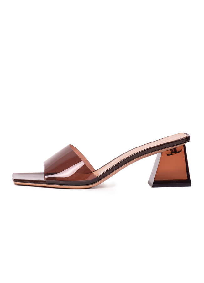 - Open square toe mules with a graphic heel, soft transparent upper and leather insole with logo.