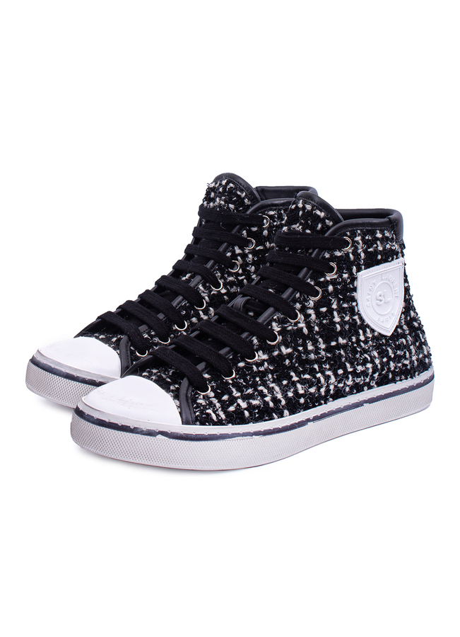 • Tweed high sneakers with a round rubber sock and a lace clasp. Stripe with logo on the side, ankle length and flat rubber sole.