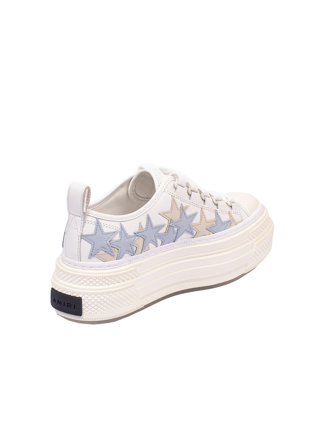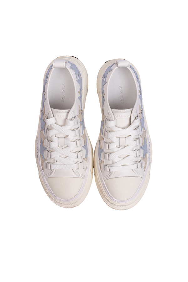 - White leather sneakers from Amiri with a round toe, lace-up design, leather sole, side logo and leather stars.