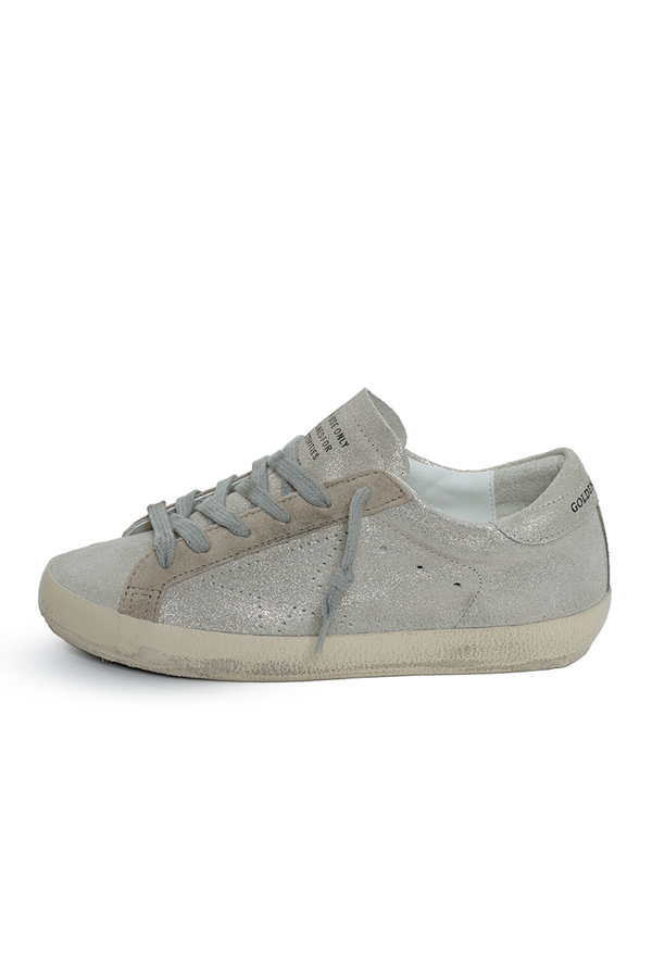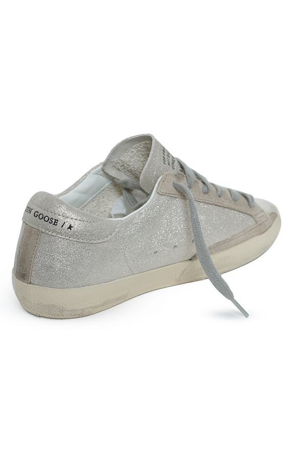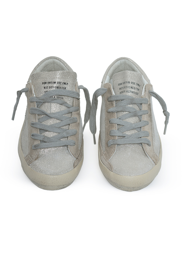 - Leather sneakers, glitter upper, lace-up fastening, engraved lettering and symbols details, rubber sole with a distressed effect