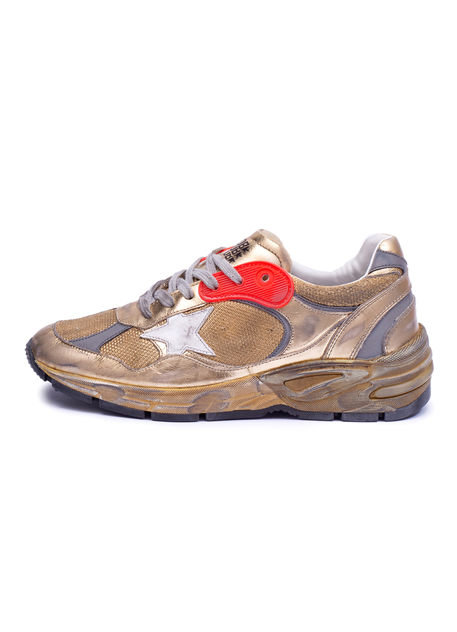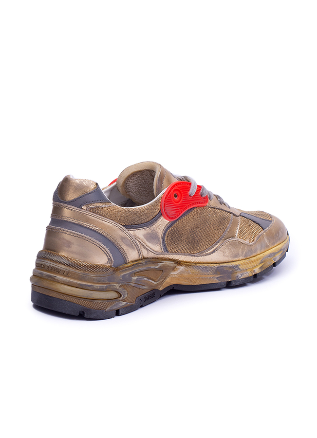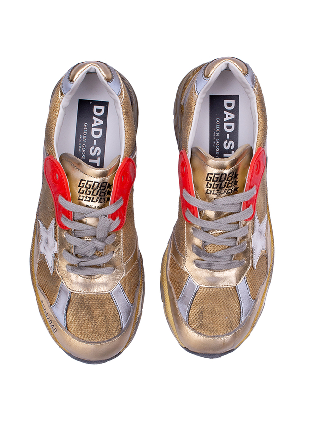 - Women's running dad sneakers with upper in used-effect fabric and laminated leather. Used-effect leather in contrast on outer side. Iridescent insert at back, the 1. 5 cm-high raised insole in leather. Leather and cotton terry lining, rubber sole.