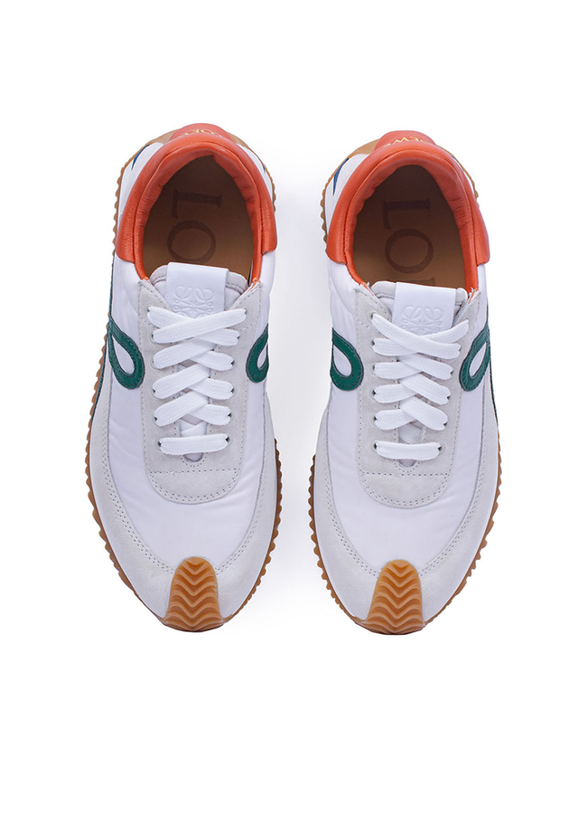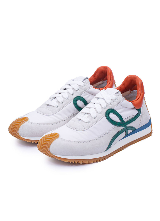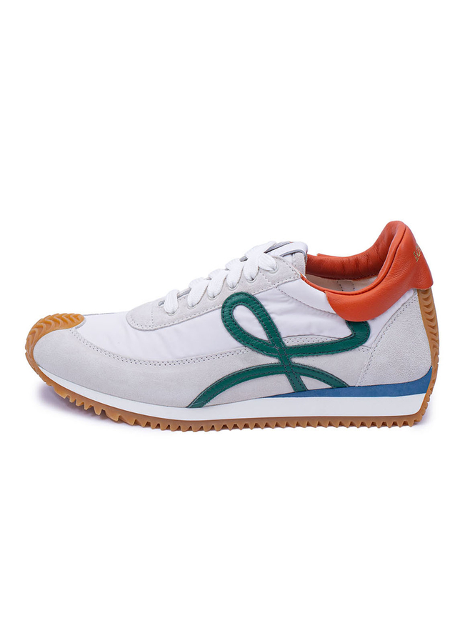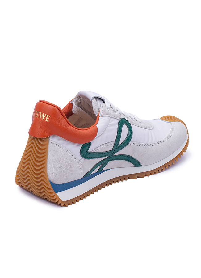 - Suede Flow Runnes sneakers with textile inserts. On a lace, with a soft top and a sole made of honey rubber, which bends around the turn and to the back of the heel. Stripe with a logo on the side.