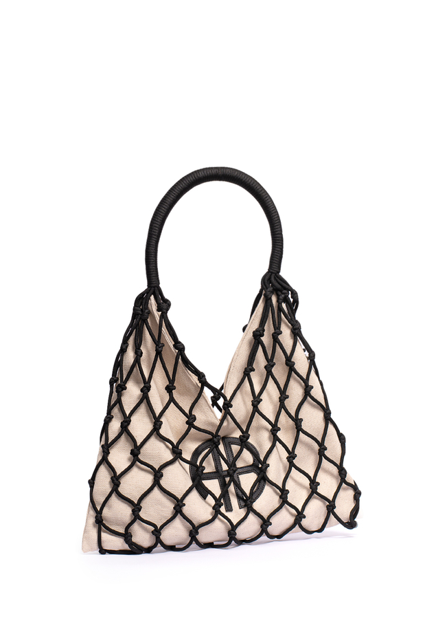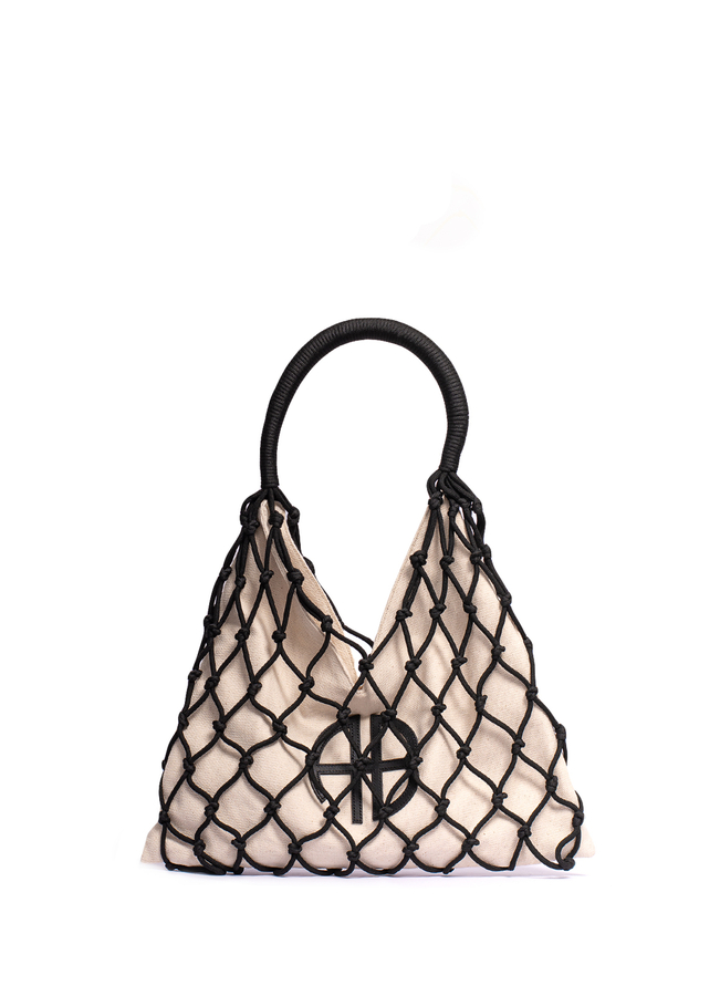 - Mesh Tote Bag, Single Compartment, Inside Pocket, Front Leather Monogram, Magnetic Button, Round Woven Handle