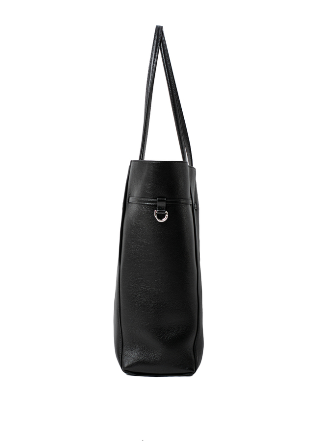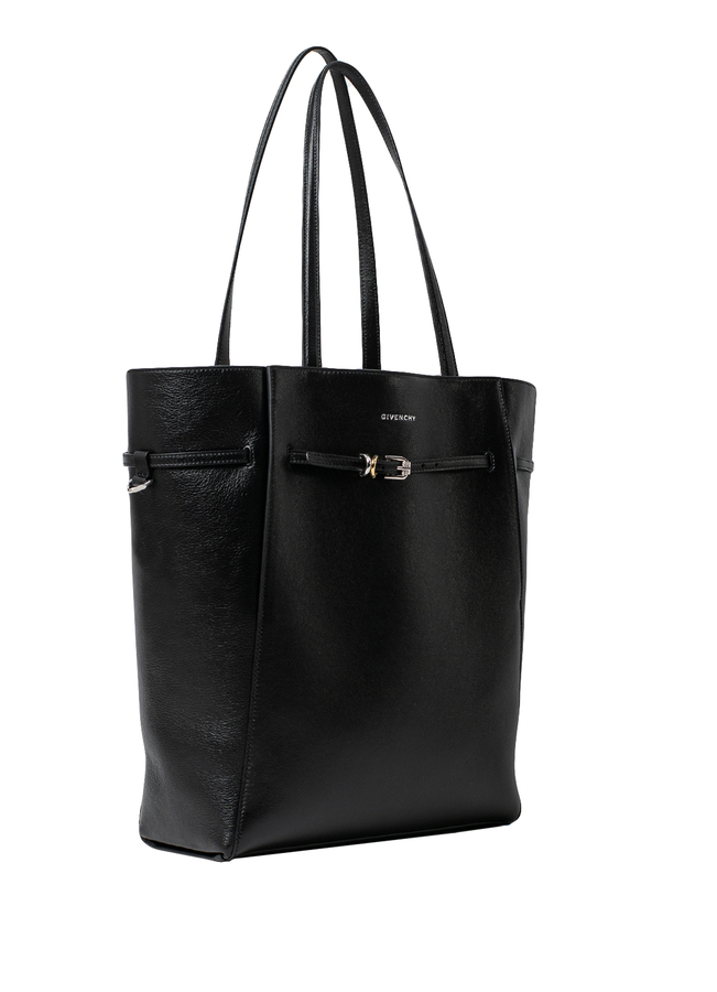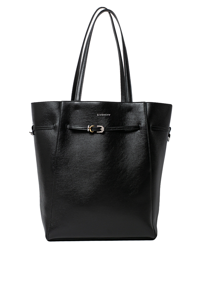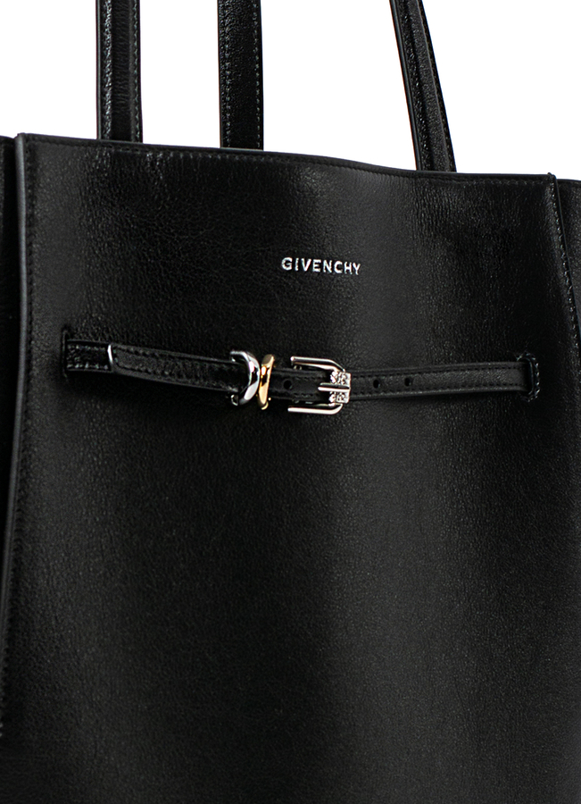 - Black leather tote with two long leather handles, GIVENCHY logo on front, adjustable leather strap with metal buckles, one internal compartment.
