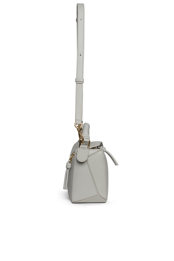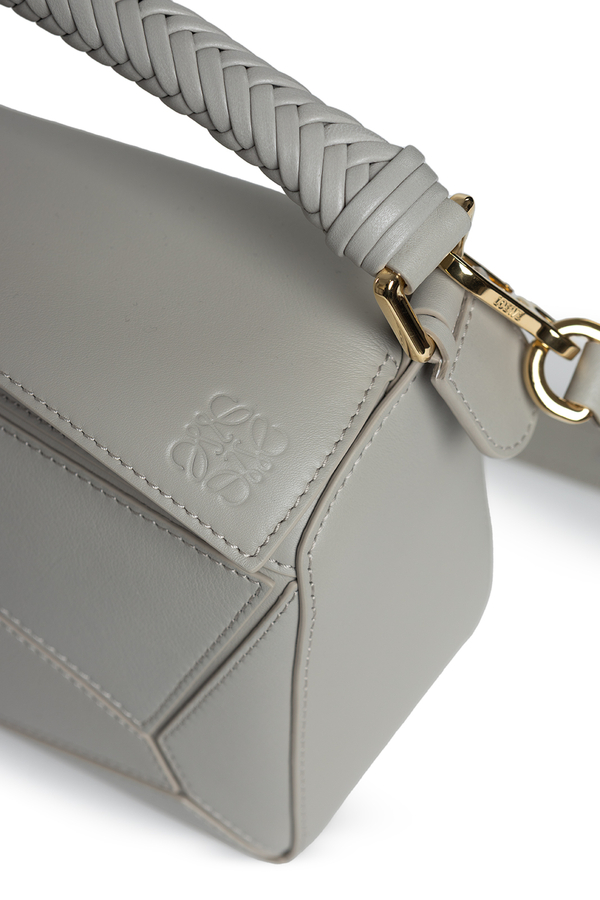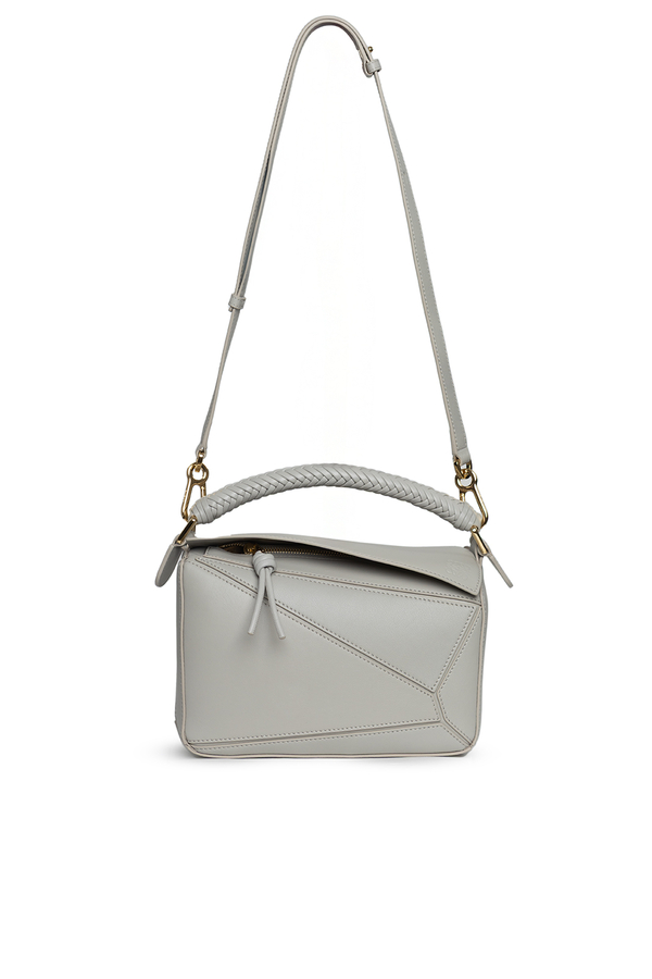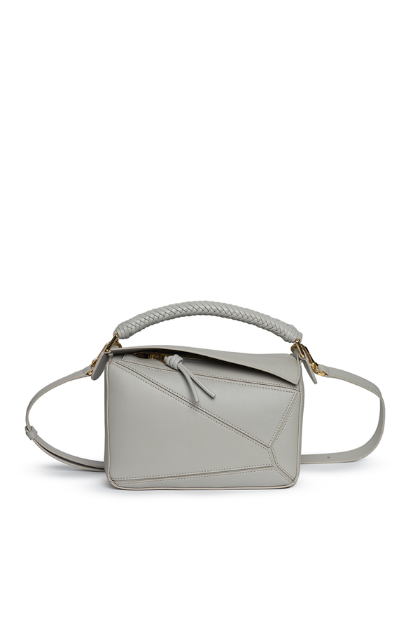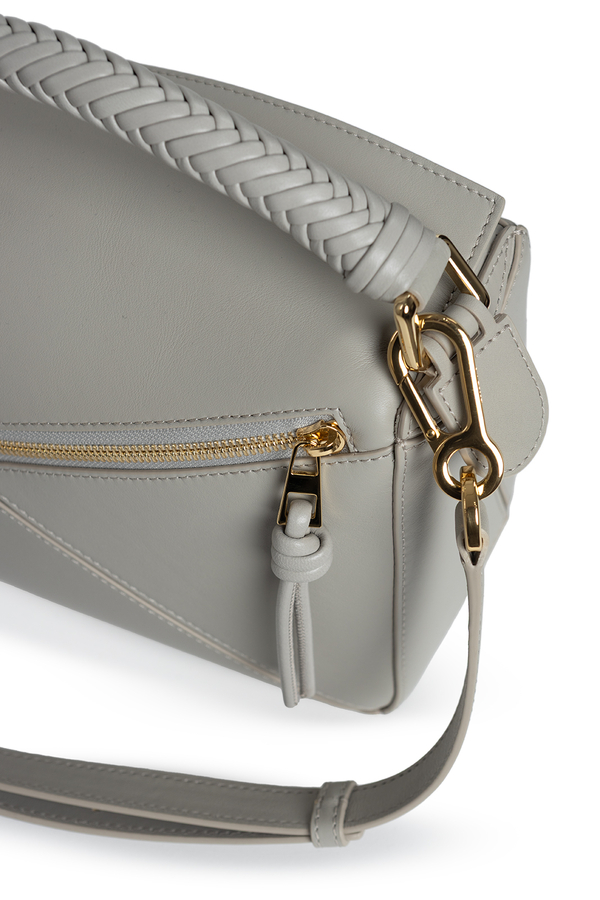 - Leather bag with the characteristic geometric lines of Puzzle, braided handle, removable and adjustable shoulder strap, zip fastening, external back pocket with zip and one internal patch pocket, embossed anagram