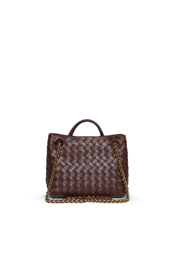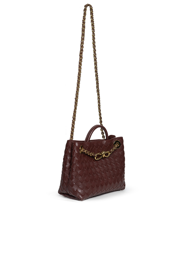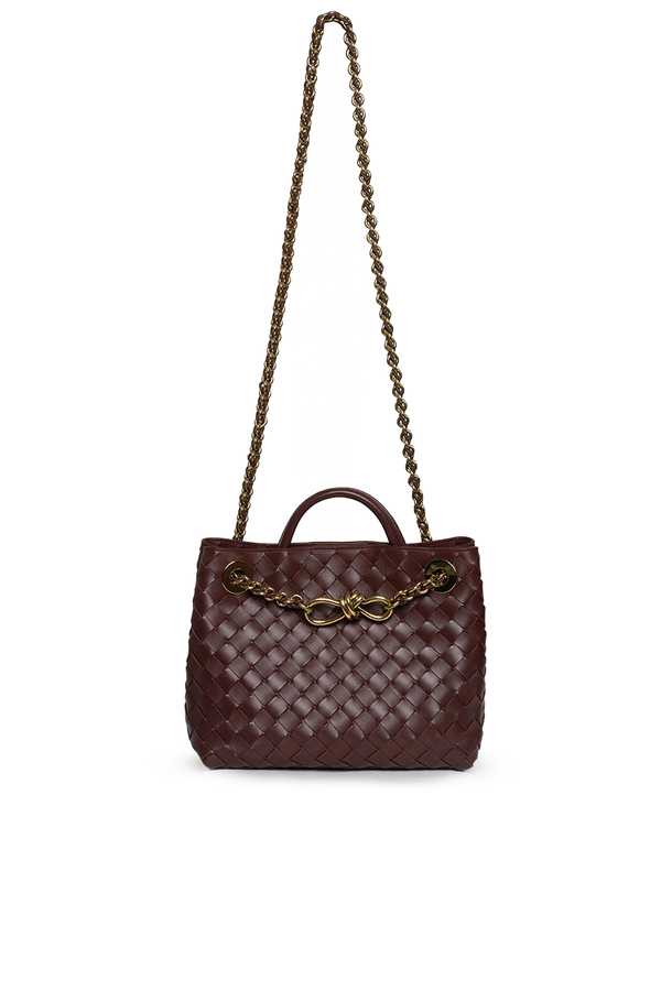 - Andiamo leather bag in size Small, Intrecciato weave, branded metal knot, one compartment, zip pocket, magnetic closure