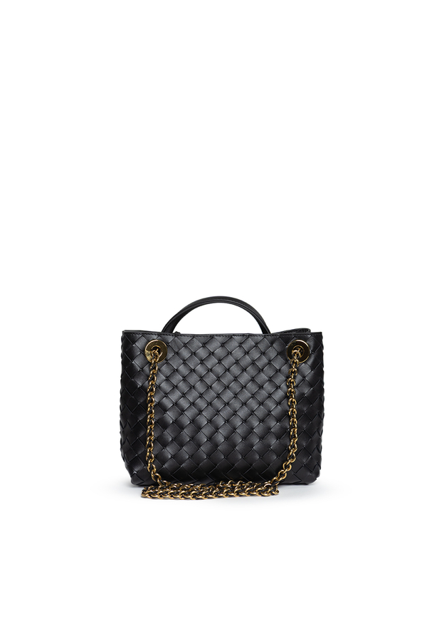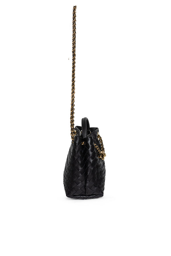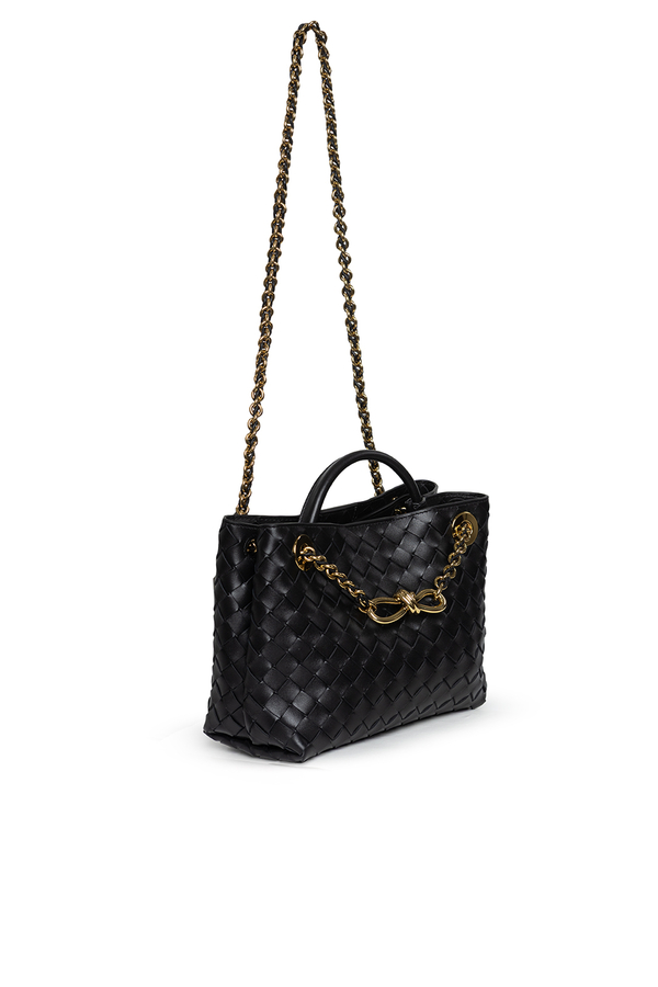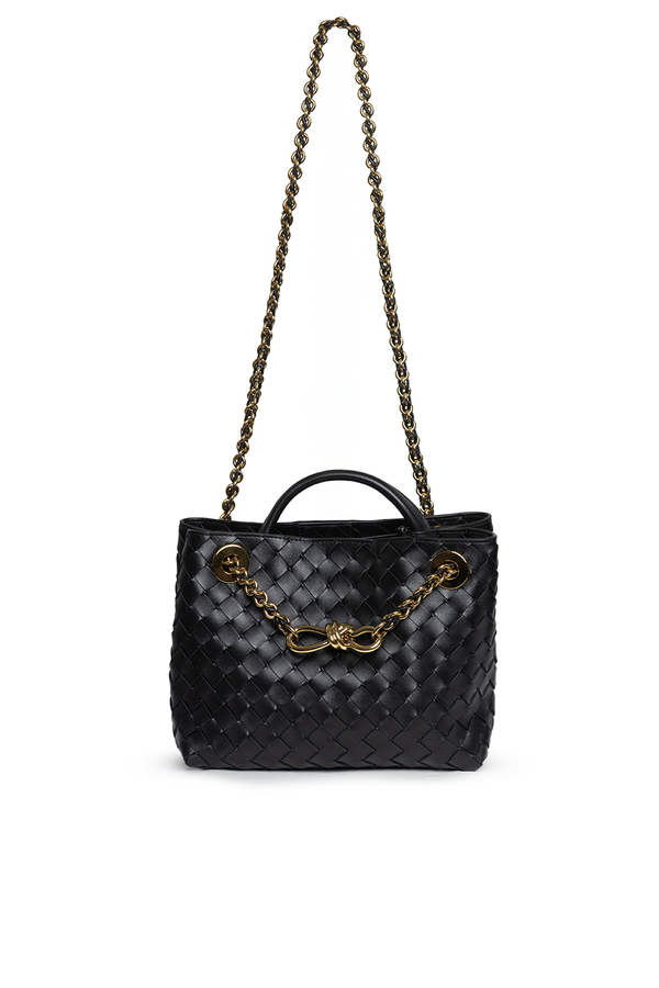 Andiamo leather bag in size Small, Intrecciato weave, branded metal knot, one compartment, zip pocket, magnetic closure