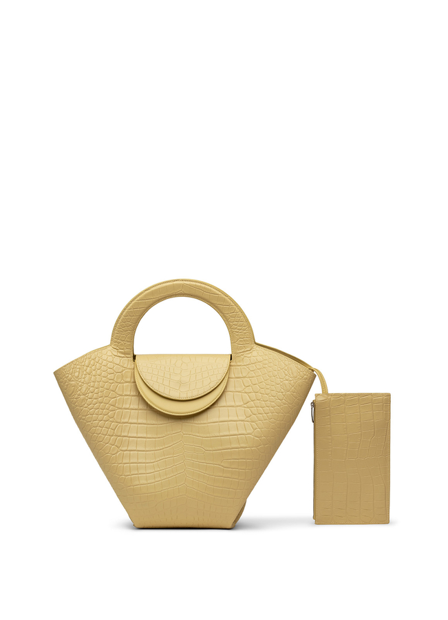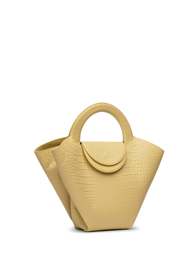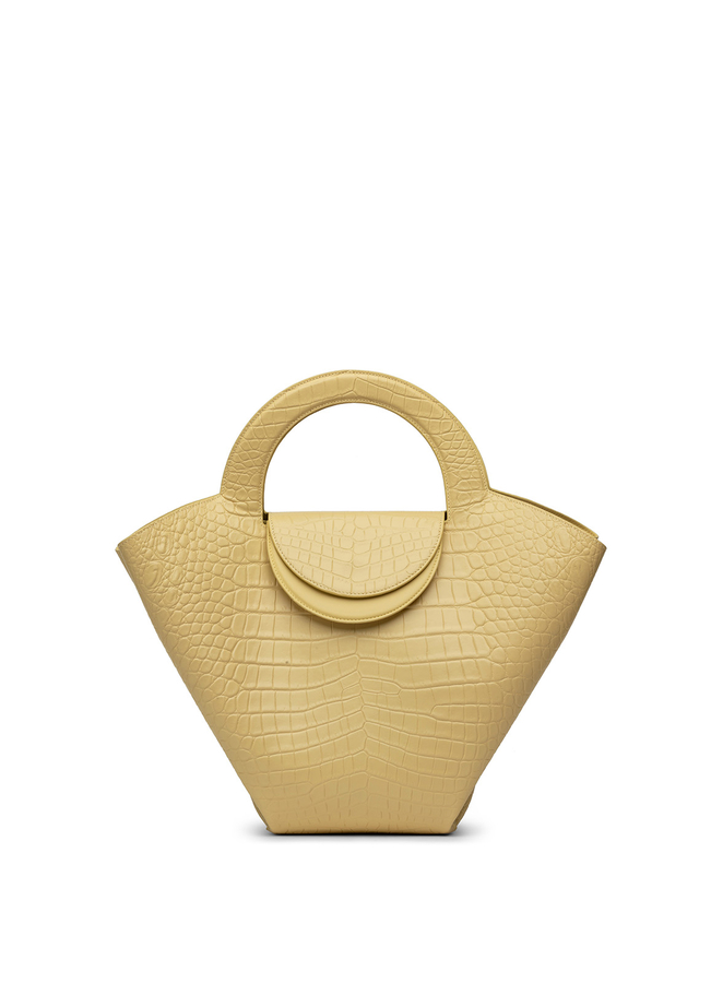 - Doll tote bag embossed under the skin of a crocodile. Round handles, magnetic clasp, gold fittings.