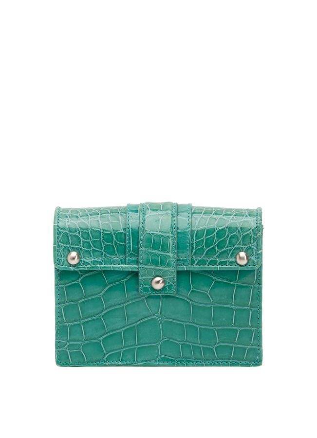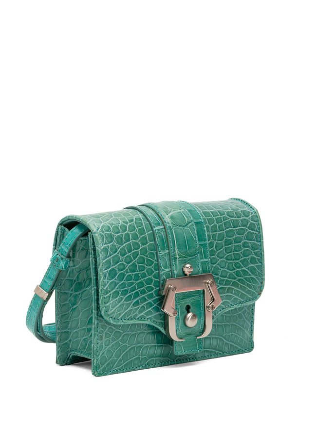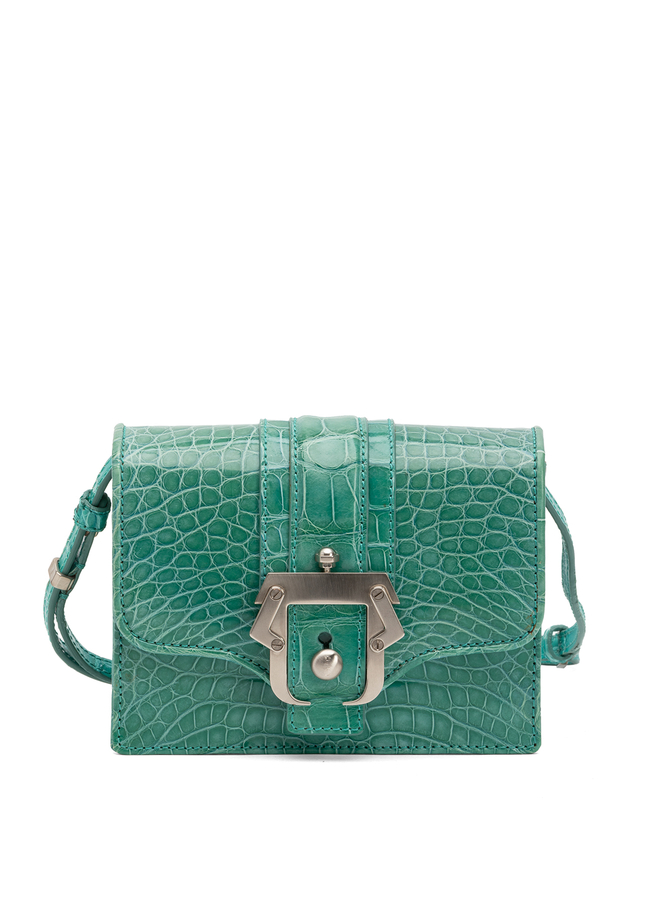 - Crocodile leather handbag with a long shoulder strap. Fastener on the top hinged valve. Decorated with a silver buckle in front.