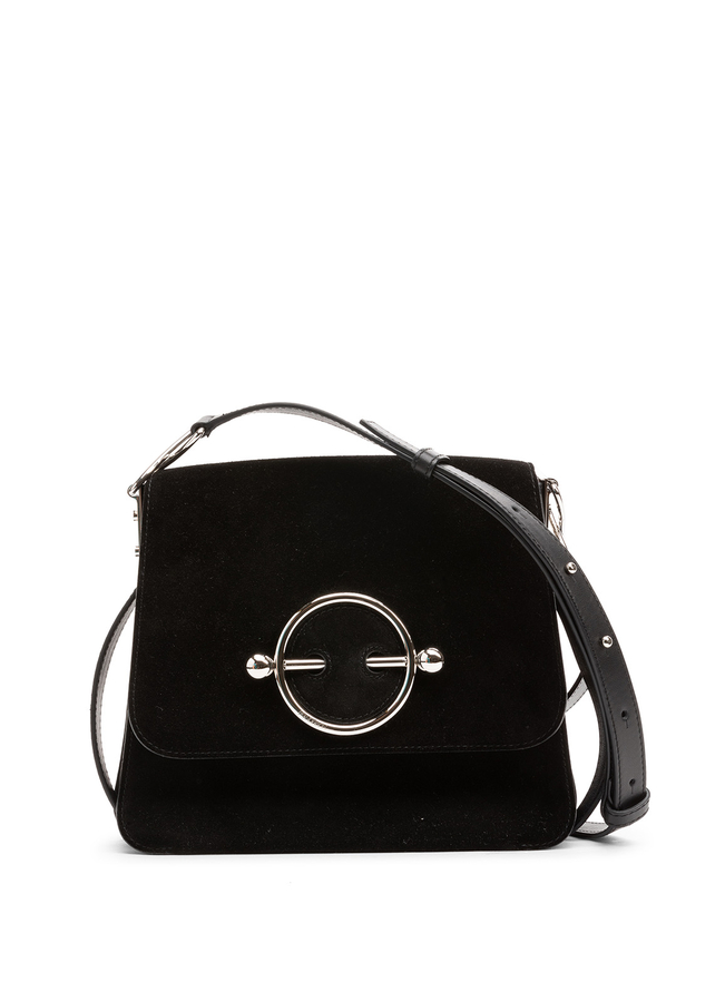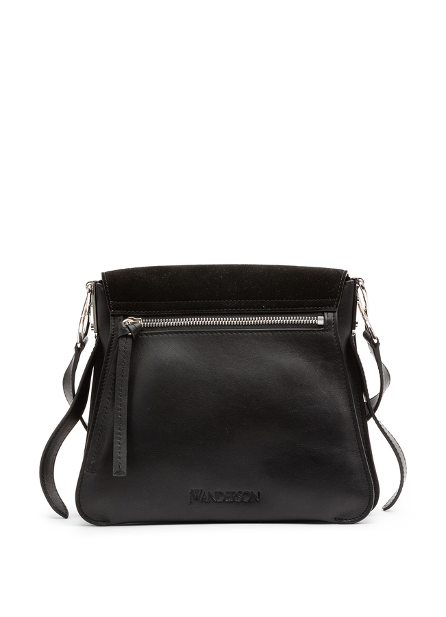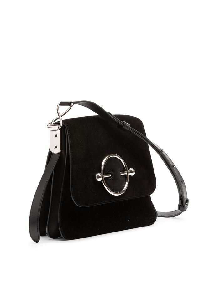 - JW Anderson suede and leather shoulder bag with removable adjustable shoulder strap, hinged top, inside patch pocket, silver fittings, zipper and stud with a front pin.