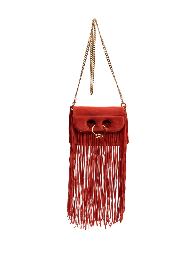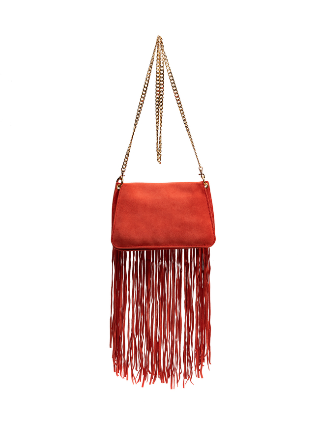 - The bag is small, suede with a fastening on the upper flap. Decorated with a golden ring and a long fringe. Dovgy strap-lance over the shoulder.