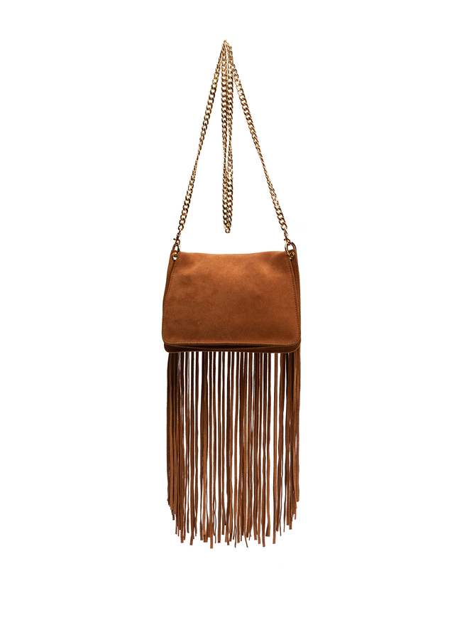 - Suede small bag with a clasp on the top flap. Decorated with a gold ring and fringe. The handle is a long gold chain.