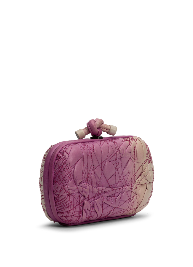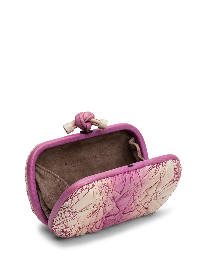 - Bottega Veneta Knot leather clutch, with a pink leather-covered decorative frame and a decorative knot-shaped clasp. Design of crumpled leather with a decorative stitch of pink threads. Suede lining.