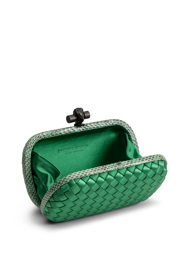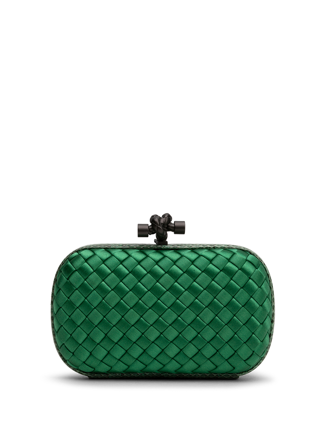 - Bottega Veneta woven silk Knot clutch with ayers-covered frame and burnished metal knot closure. Satin lining.